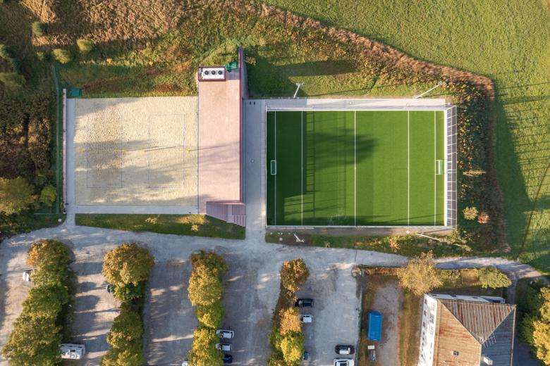 Weiters wird die Hanglage genutzt, das Infrastrukturgebäude so zu integrieren, dass es als Verbindungsbau der beiden Sportplätze die Höhenstufe bildet. Die untere Ebene gewährt den Zugang zum Gebäude mit Garderoben und Sanitärräumen, Eislaufschuhverleih, Technikraum und Garage für Wartungsfahrzeug. Die obere Ebene erzeugt als Verlängerung des Beachvolleyballplatzes eine Spiel- und Aussichtsterrasse mit Boulderturm, der gleichzeitig für die Platzierung der Rückkühler genutzt wird.