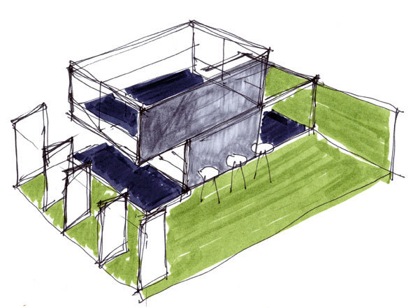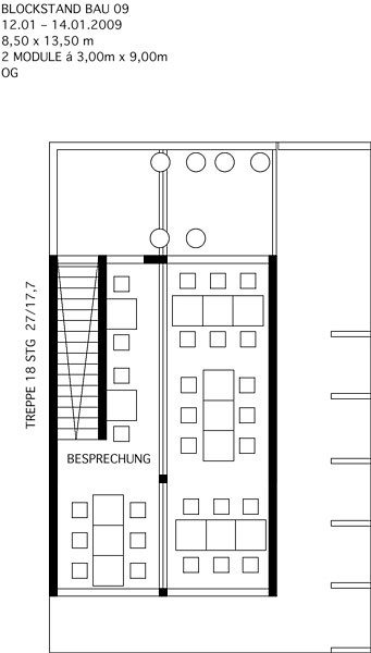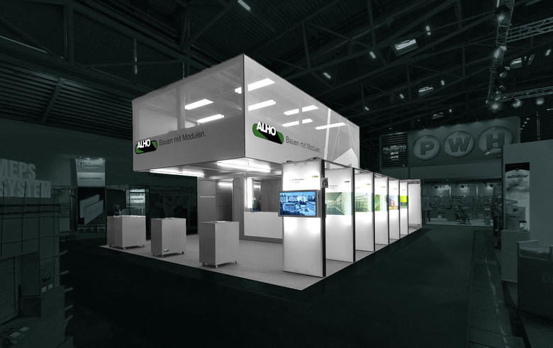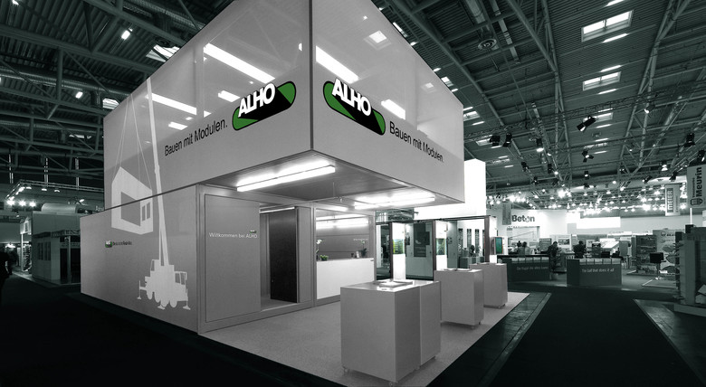 Die Vielfalt des Modulbaus präsentierte ALHO auf der Bau 2009 in München mit Hilfe eines komplexen Baukörpers. Durch das Verschieben des Obergeschosses werden unterschiedlichste räumliche Situationen erlebbar. So beinhalteten die 2 Container im Erdgeschoss den überbauten Empfangsbereich, die allseitig umschlossenen Nebenräume und den offenen Bewirtungsbereich. Eine einläufig gefaltete Stahltreppe führt zu einem großzügigen und offen gestalteten Besprechungsraum im Obergeschoss.