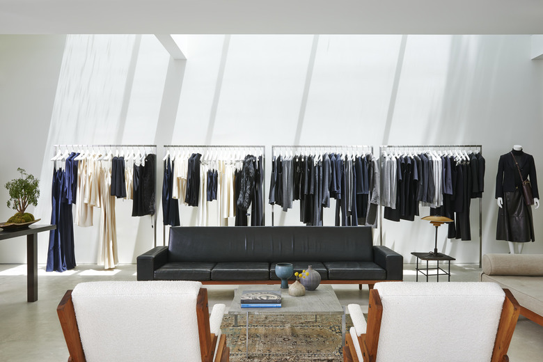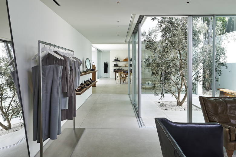The retailer’s first flagship store embodies the essence of California Modernism by blending interior and exterior spaces. The gallery-like interior is retail focused with a residential-infused spirit and includes sitting areas with fireplaces, foyer, galleries, and several distinct courtyards. Slipping through the double-height entry courtyard, customers are pulled through an over-scaled glass door featuring a custom bronze logo knob and into the foyer, which looks out onto the pool lounge. Natural light floods into the galleries flanking both sides of the pool through operable floor-to-ceiling structural glass doors and a new 25-foot-long skylight. Custom brushed stainless-steel garment rails line the edges of the space, complimented by custom steel-blade shelving for bags and shoes. Tung-oiled walnut display pieces inset with pigskin panels float in the hallways between the galleries and salon. The material palette reflects the brand’s curated aesthetic of polished minimalism and refined detailing, balancing natural textures-- walnut, antiqued limestone-- against matte white concrete, large expanses of minimally framed glass, and brushed metal finishes. A distinctive mid-century collection of furniture throughout , as well as lush native plantings, layer subtle color tones and warmth into the design.