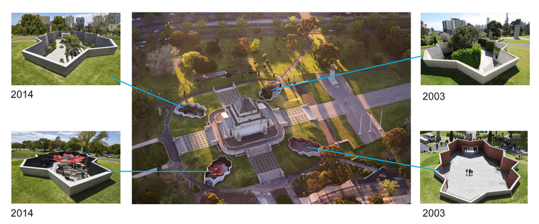 The Shrine is Victoria's most significant community memorial. Funded originally by donation, the building and its grounds terminate the main civic axis of Melbourne. The Shrine has had two significant stages of alterations and additions since it was first constructed to the original Hudson & Wardrop design in 1934. These are the WW2 forecourt, opened in 1954 by Her Majesty Queen Elizabeth on her first visit here, and the new Visitor Centre (2003) and Galleries of Remembrance (2014), with the four courtyards designed by Rush\Wright Associates (RWA) and Ashton Raggatt McDougall, Architects (ARM).