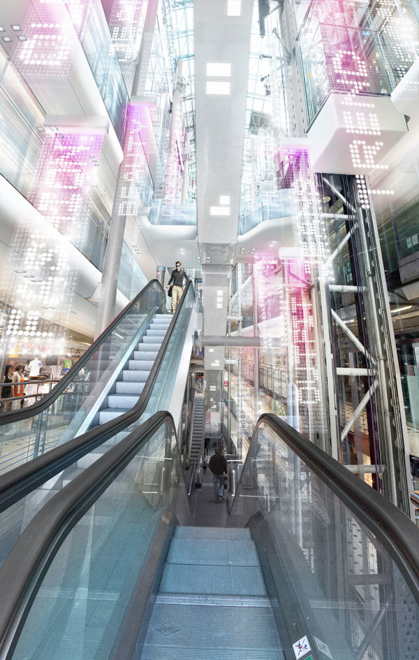 Das innenarchitektonische Konzept greift die ursprüngliche Idee einer vertikalen Stadtstruktur auf und setzt sie in zeitgemäßer Optik um. Nach Betreten des Gebäudes werden die Besucher von dem Blick in das zehn Geschoss hohe Atrium gefangen genommen: ein faszinierender Kosmos aus sich kreuzenden Rolltreppen und Laufwegen, Trag- und Versorgungsstrukturen sowie unzähligen Lichtquellen, deren Form und Anordnung an illuminierte Hausfassaden erinnern. Der erste Raumeindruck vermittelt Vitalität und urbane Vielfalt – ohne jedoch an Klarheit einzubüßen, da der bisherige Material-, Farb- und Formenmix stark zurückgenommen wurde. Das vorwiegend in Weiß gehaltene Interieur steht in einem spannungsvollen Kontrast zur schwarzen Fassade und schafft ein ansprechendes helles Ambiente. Einen besonderen Blickfang bietet die über sämtliche Etagen reichende LED-Installation, die einen wahren Wasserfall aus Licht durch das Atrium strömen lässt.