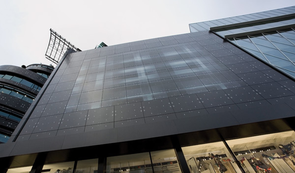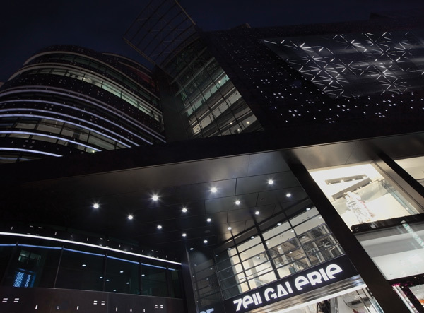In ihrer Eigenschaft als Markenarchitektur sollte das Erscheinungsbild der Zeilgalerie Zeitströmungen und Designtrends widerspiegeln können. Mit Hilfe einer komplex programmierten Lichtinszenierung wird das Aussehen der Zeilgalerie wandelbar und schafft mit seiner Mehrdeutigkeit die Voraussetzung für individuelle Lesbarkeit und Identifikation. Zudem erzeugen mehrere unterschiedlich gestaltete Fassadenebenen reizvolle Überlagerungseffekte und optische Tiefenwirkung. Die sanft pulsierende Lichtornamentik der Medienfassade des rechten Baukörpers beinhaltet eine große Vielfalt ästhetischer Bilder: klare geometrische Muster verwandeln sich fließend in organisch anmutende Licht- und Schattenspiele; feine lineare Akzente wechseln sich mit eindrucksvollen großflächigen Effekten ab. Die Lichtinszenierung der Zeilgalerie versteht sich als künstlerisch-abstrakte Umsetzung von Leuchtwerbung, welche seit langem fester Bestandteil der Architektur kommerzieller Gebäude ist. Anstelle konkreter Werbebotschaften transportiert sie die städtische Lebendigkeit des Ortes in Form stimmungsvoller Lichtbilder.