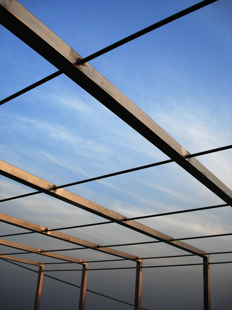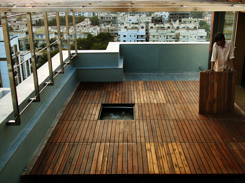 The choice of Stainless Steel, Wooden slats and Bamboo chicks as the core architectural elements became obvious as we set out a brief to have a terrace garden that takes less time to maintain and gives more time to entertain self and others. The amalgamation of these urbane and rustic materials create a space that filters the sunlight through porous Roof; provides privacy through Screens; frames scenic vistas of the glistening river, open fields and sprawling city through raised Deck; and ensures healthy growth of plants through elevated Racks for the pots. All this while one sits down and takes in the fresh breeze from Arabian Sea and River Tapi.