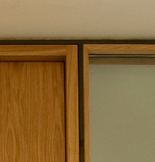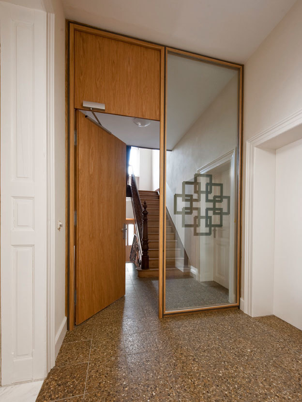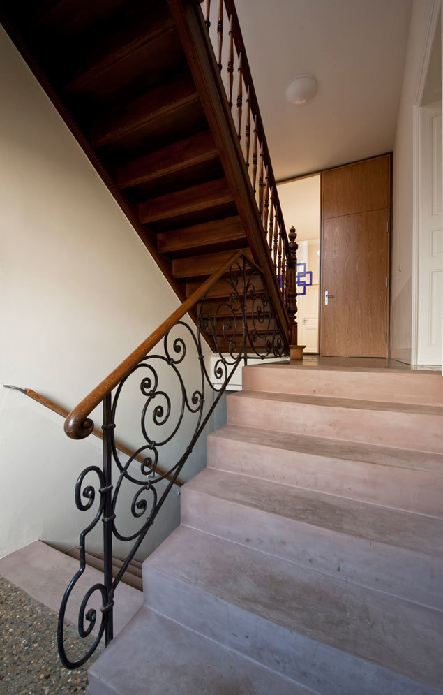 Nutzung EG+OG Pfarrbüro+Räume für die Gemeinde. Im öffentlichen Flur+ Treppenraum wird die vorhandene Bausubstanz freigelegt, aufgearbeitet und sichtbar gemacht. Das neue, große Türelement und notwendige Ergänzungen sind handwerklich gefertigt.
