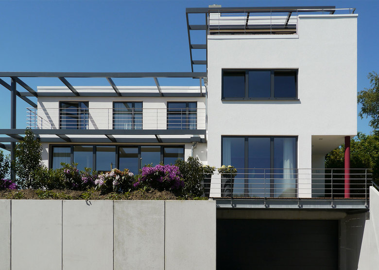 Die klaren Formen in Kombination mit der schlicht gehaltenen weißen Putzfassade unterstreichen die Architektur des Gebäudes als moderne Interpretation der Bauhaustradition. Die vorgelagerten Rahmen, die zum Teil auch als Sonnenschutz fungieren, lassen das Haus mit seinen kubischen Formen leicht erscheinen und vervollständigen die Kubatur der Außenhülle.
