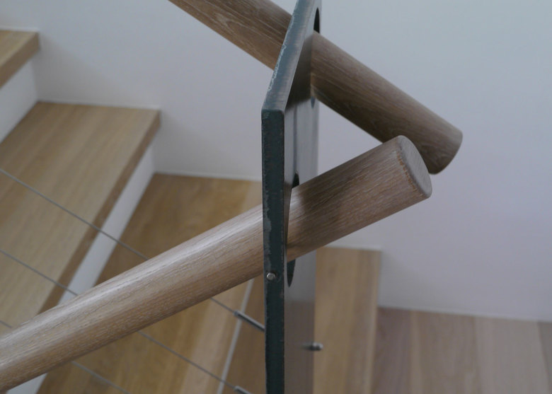 In den, ebenso wie die Decken, weiß geputzten Wände sind Türen und Fußleisten flächenbündig integriert. Lediglich wenige Wände sind zur gestalterischen Akzentuierung farbig lasiert. Für die Fußböden wurden durchgängige Eichendielen verwendet, die sich in den Treppenstufen fortsetzen. Auch hier wurde die gradlinige Architektur mit Trittstufen und Handlauf aus geschliffener Eiche umgesetzt.