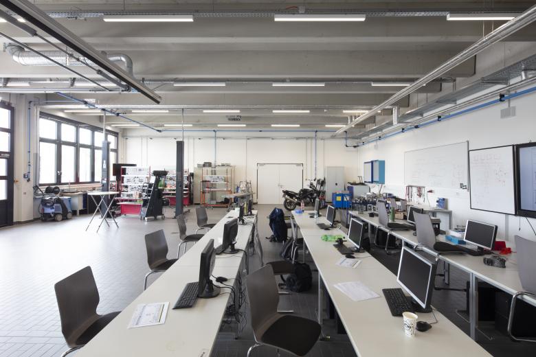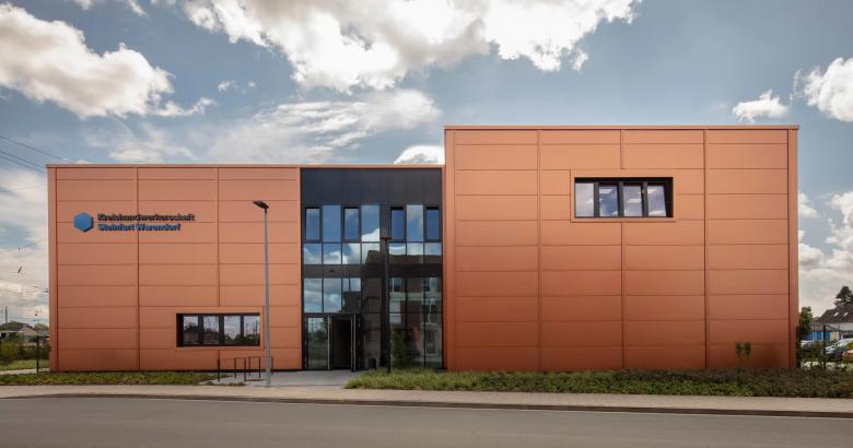 Innen funktional und effizient geplant, zeichnet sich der Baukörper nach außen durch seine auffällige Fassade aus. Kupferfarbene Metall-Sandwichplatten werden mit Fenstern kontrastiert, die in dunkelgraue Paneele eingefasst sind und dann als Fensterbänder in Erscheinung treten. Eine weitere Zeitersparnis – und gleichzeitig einen pädagogischen Mehrwert – erzielten wir durch die konsequente Ausführung der Haustechnik als Aufputz-Installation. So mussten keine Leerrohre bei der Bauteilfertigung berücksichtigt werden, und gleichzeitig entstand ein Bildungsort, an dem viele Gewerke am „lebenden Objekt“ lernen können.