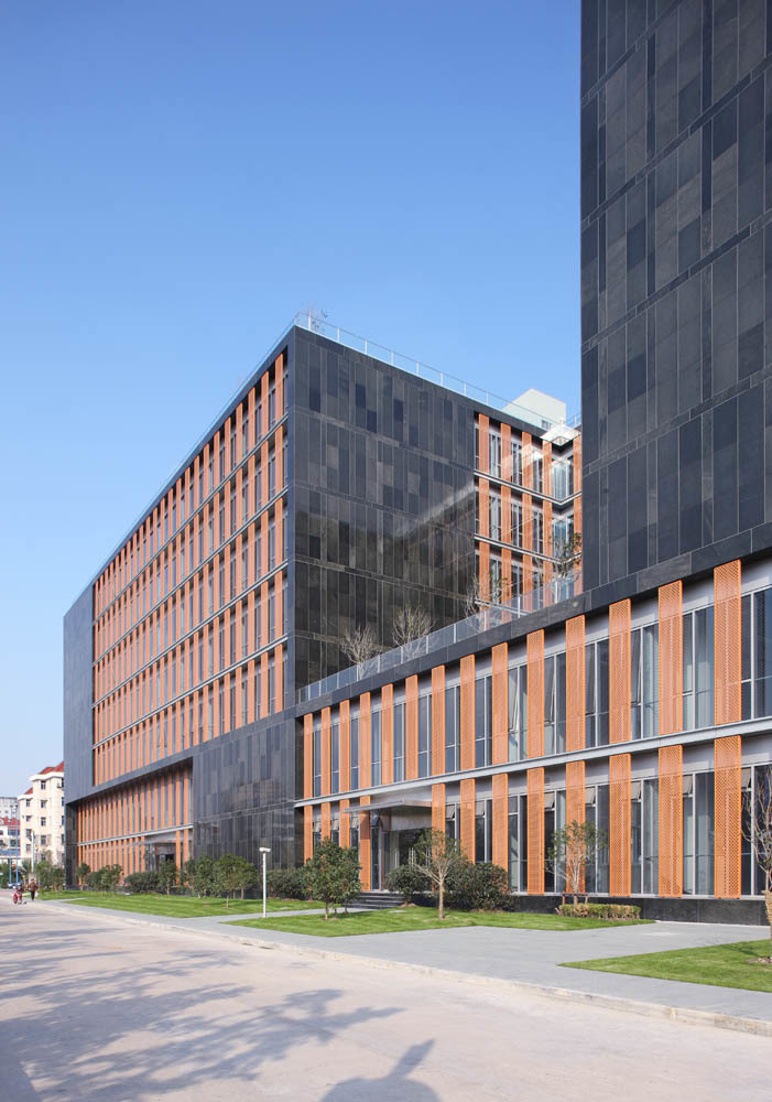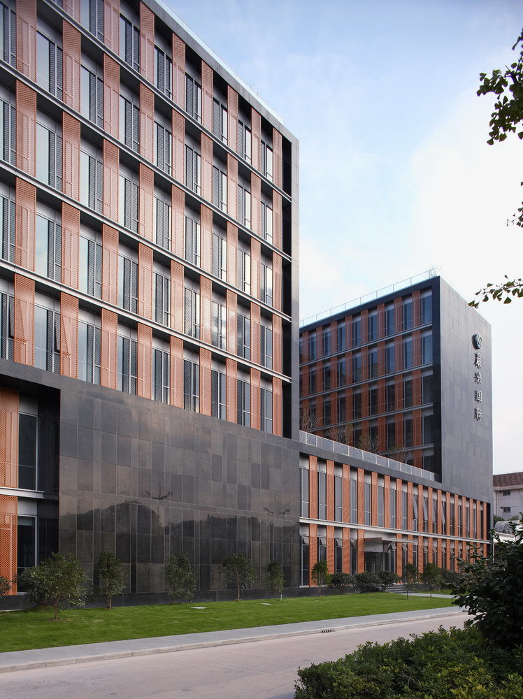 The building is shaped by an “S” volume to gain more south-north surfaces for natural light and ventilation on this east-west oriented site.  It gives two semi-enclosed exterior spaces to the project: the east courtyard offers efficient areas for the drop-off and lobby entry while the west courtyard stays on the third floor to provide a quiet outdoor garden for the tenants of the offices.  A linear staircase in the double-height lobby links these two courtyards vertically to create more opportunities for public activities.
