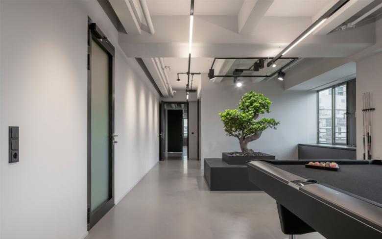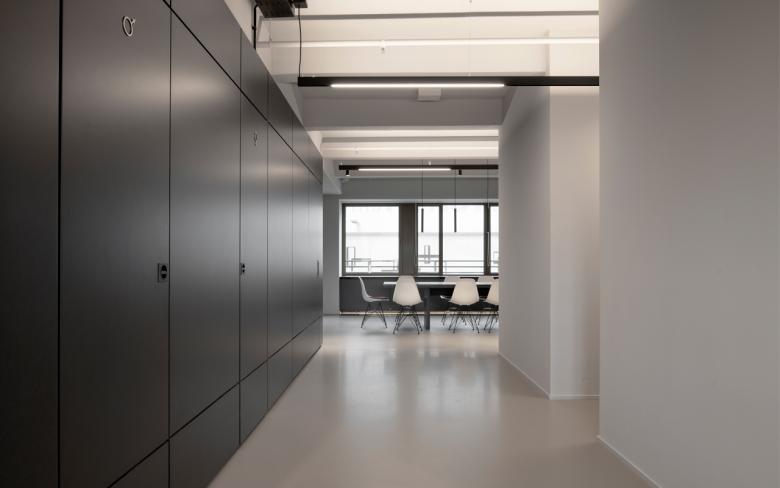 Da die neuen Büroräume Loft-Charakter bekommen sollen, verzichten wir auf abgehängte Decken. Unterhalb der hell gestrichenen Geschossdecke verlaufen Versorgungsleitungen und unterschiedlich hohe Betonunterzüge. Die schwarzen Paneele der Wandbekleidung enden auf einheitlicher Höhe unterhalb des tiefsten Unterzugs, sie bilden eine Art Horizontlinie. Schwarze Stromschienen zeichnen sich ebenfalls kontrastreich vom hellen Deckenraum ab.