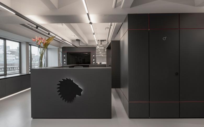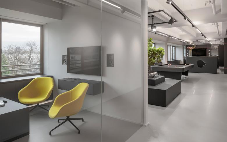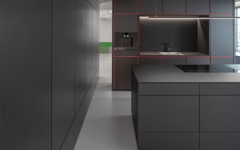 Der Hell-Dunkel-Kontrast setzt sich als gestaltungsgebendes Element auch am Boden fort. Alle raumbildenden Ausbauten und Einrichtungsgegenstände, die auf der hellen, fugenlos verarbeiteten Industriebeschichtung stehen, sind schwarz. Vereinzelt blitzen Farbklekse aus dem strengen Farbkanon hervor. Allen voran verleihen die strahlend neonorangen Möbelfugen der gesamten Szenerie eine spielerische Frische.