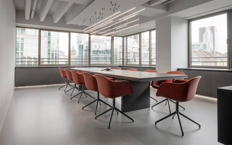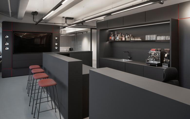 Die Treffpunkte sind das Zentrum der Agentur. Hier sind die Wände mit mattschwarzen MDF-Tafeln bekleidet, die mittels grell neonoranger Möbelfugen horizontal und vertikal unterteilt sind. Aus den Wandbekleidungen ragen abgeschrägte Möbeleinbauten hervor, die als rückwärtige Arbeitsflächen der Bar- und Küchentresen dienen.