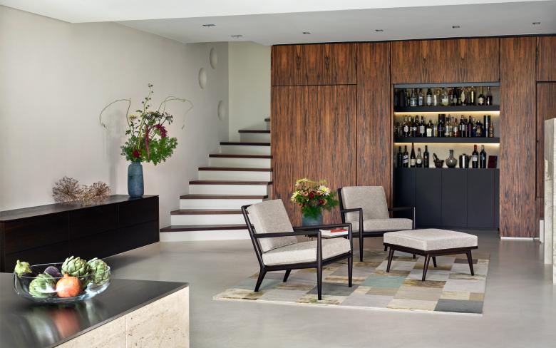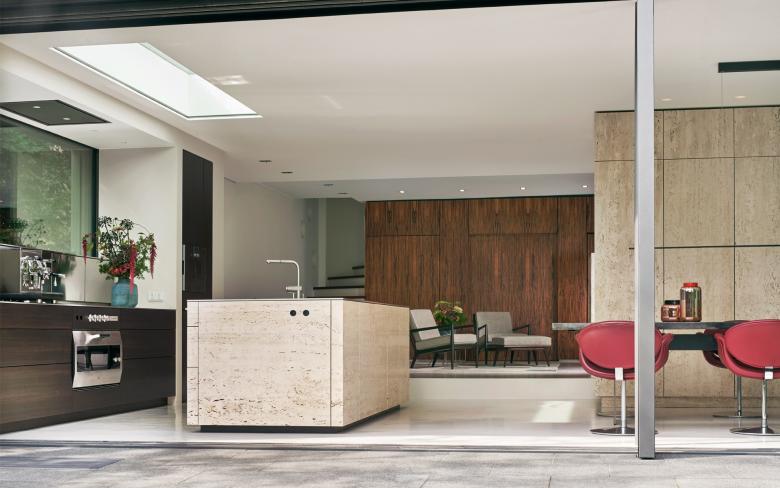 Der Frankfurter Stadtteil Bergen liegt am Rande des Naturschutzgebietes Berger Hang. Das Einfamilienhaus stammt aus den 1970er Jahren. Dank eines neuen Anbaus mit großzügigen Glasflächen liegen Wohnräume und Küche nun ebenerdig zum Garten. Zur bauzeitlichen Einrichtung gehören der offene Kamin und eine Wandvertäfelung aus Palisanderholz, hinter der sich die Hausbar befindet. Die Feuerstelle des Kamins ist seit jeher mit Römischem Travertin bekleidet, dessen sandfarbene, poröse Oberfläche mit unzähligen kleinen Hohlräumen durchsetzt ist. Sämtliche neu entstandenen Einbauten sind ebenfalls aus Travertin gefertigt. Die natürliche Anmutung der zerklüfteten Naturstein-Oberfläche steht in einem spannungsvollen Gegensatz zu den geradlinigen Volumen, die aus dem Stein gebildet sind: