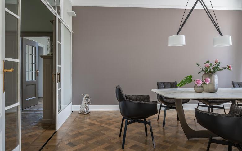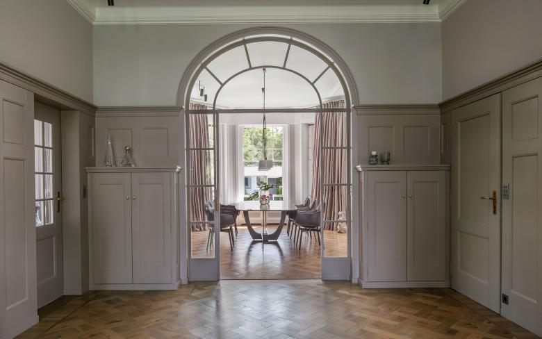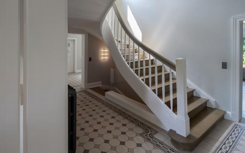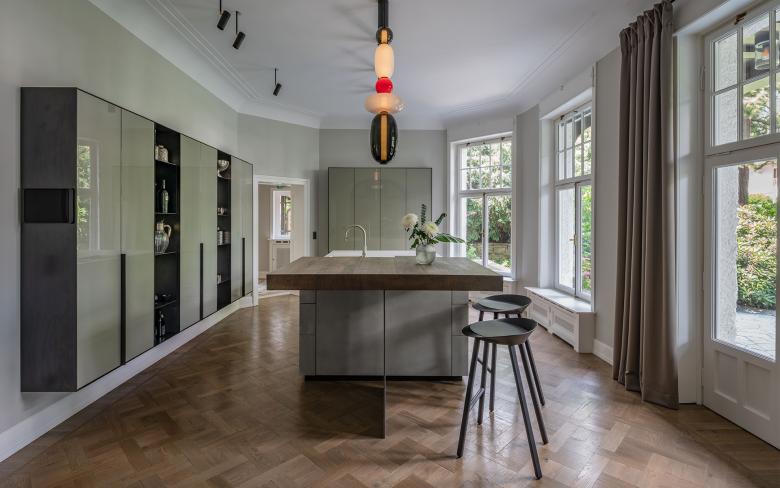 Fenster, Türen, das komplette Holzwerk, der Stuck und die historische Treppe im Eingangsbereich werden restauriert oder originalgetreu nachgebaut. Die neuen Bodenfliesen sind nach historischen Vorbildern aus gebranntem Feinstein-Steinzeug gefertigt. Die ebenfalls neuen Garderobenschränke aus geräuchertem Eichenholz bilden dank ihrer feingliedrigen Rahmenstruktur das stilistische Bindeglied in die heutige Zeit. Nach dem Entrée gelangt man in das zentrale Kaminzimmer. Von hier aus hat man Zugang zur Küche, zur Bibliothek und zum TV-Zimmer. Diese repräsentativen Wohnräume sind mit exklusivem neuem Tafelparkett aus geräuchertem Eichenholz ausgestattet. Die Wände des Kaminzimmers sind umlaufend mit einer kassettierten bauzeitlichen Wandbekleidung versehen. Der historische Kamin ist von dicken Farbschichten befreit und zeigt stolz seine rotes Klinkermauerwerk. Die neuen Eigentümer möchten in den anderen Wohnräumen auch gerne deutliche Farbakzente setzen. Die Wand hinter dem Fernseher ist tintenblau gestrichen und in der Bibliothek leuchtet die Wand hinter dem Regal von Dieter Rams in einem Fuchsia-Ton. Die Küche präsentiert sich farblich zurückhaltend. Die Küchenschränke sind eukalyptusfarben hochglänzend lackiert und in brünierten Flachstahlrahmen eingefasst. Über der zentralen Kochinsel aus grauem Beton sorgt die rote Glaskugel der Pepples-Leuchte von Boris Klimek für einen strahlenden Farbtupfer.