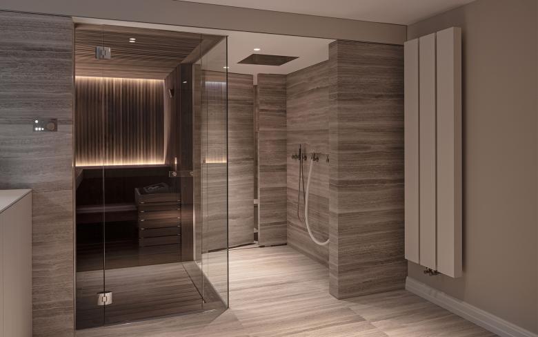 Um die Wohnfläche des Hauses zu erhöhen, ist der Boden im Kellergeschoss abgesenkt worden. Besonders Augenmerk im neu entstandenen Wellnessbereich gilt der Wandgestaltung aus Naturstein, einem Sedimentgestein mit deutlich sich abzeichnenden Gesteinsschichten. Im Stil klassischer Tapetentüren lassen nur zwei schmale vertikale Wandfugen in der Dusche erkennen, dass es sich hier eigentlich um eine Tür handelt; sie führt zum WC.
