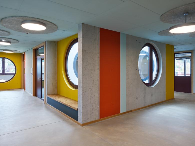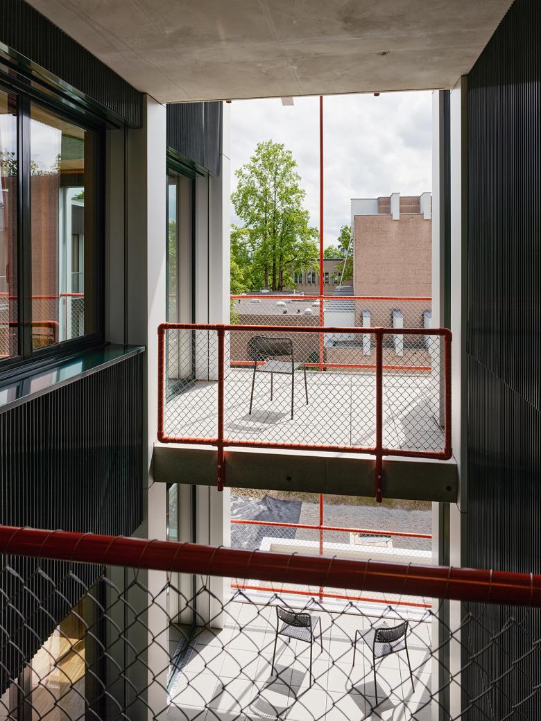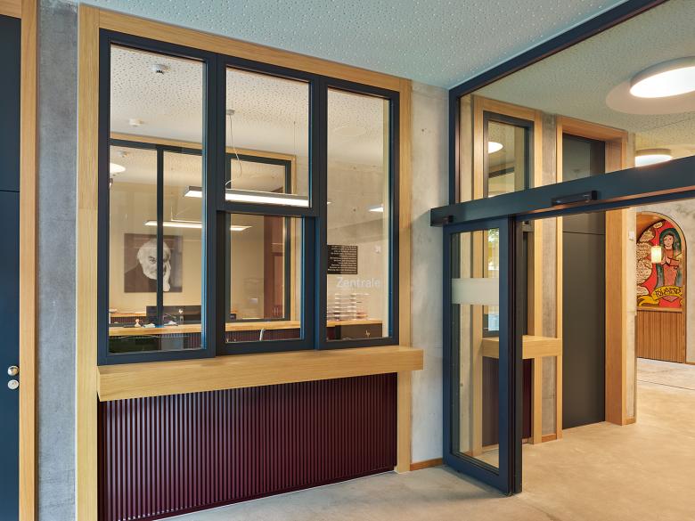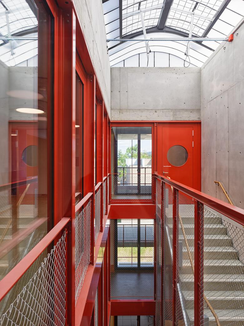 Die Neubauten suchen über ihre Stellung und Proportionen auch den Dialog mit der weiteren Nachbarschaft und mit der Stadt. Das langgestreckte Administrationsgebäude führt die Anlage direkt an die Wehntalerstrasse und verknüpft sie so mit dem öffentlichen Raum. Auch über die langen, schlanken Proportionen der drei peripheren Volumen, vor allem aber über den sechsgeschossigen Baukörper im Nordwesten, entsteht eine formale Beziehung zu den angrenzenden Wohnzeilen. So wird der Inselcharakter des erweiterten Zentrums Glaubten an gewissen Stellen aufgelöst und die Neubauten integrieren sich auf selbstverständliche Weise ins Stadtgefüge.