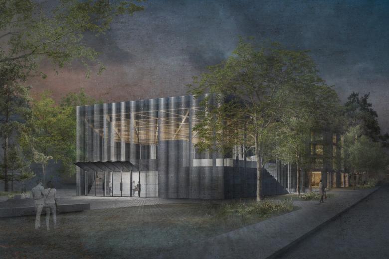 Der Grundriss des Saalbaus in Form eines reinen, gleichseitigen Sechseckes gründet wie erwähnt einerseits in der städtebaulichen Setzung. Auf architektonischer Ebene gebiert die sechseckige Form einen Zentralraum, der rundum ausstrahlt und gleichzeitig vielseitig genutzt werden kann (siehe Nutzungsdiagramme).