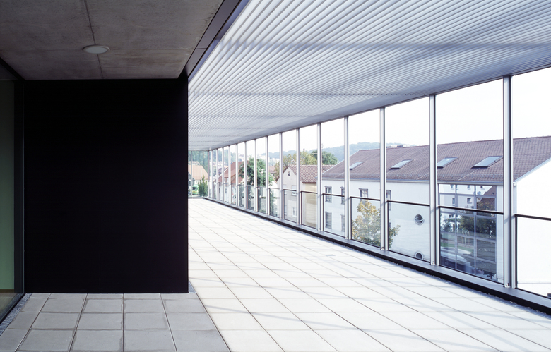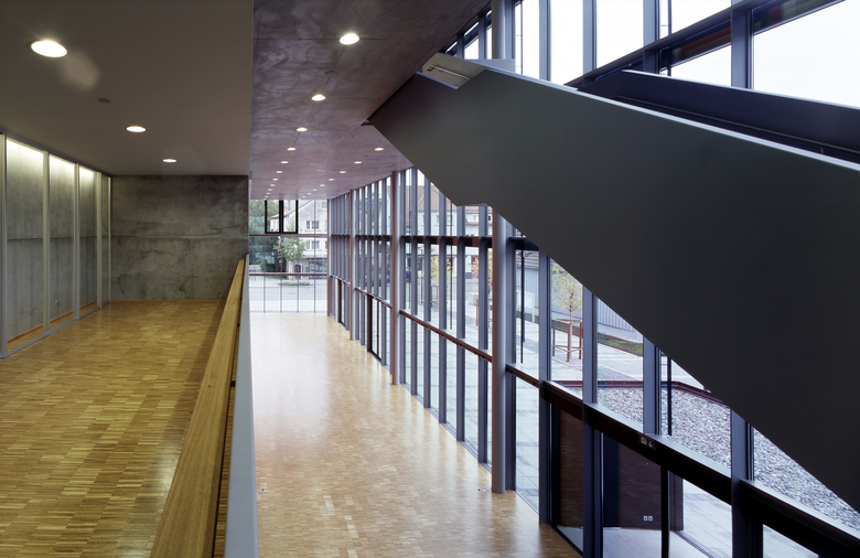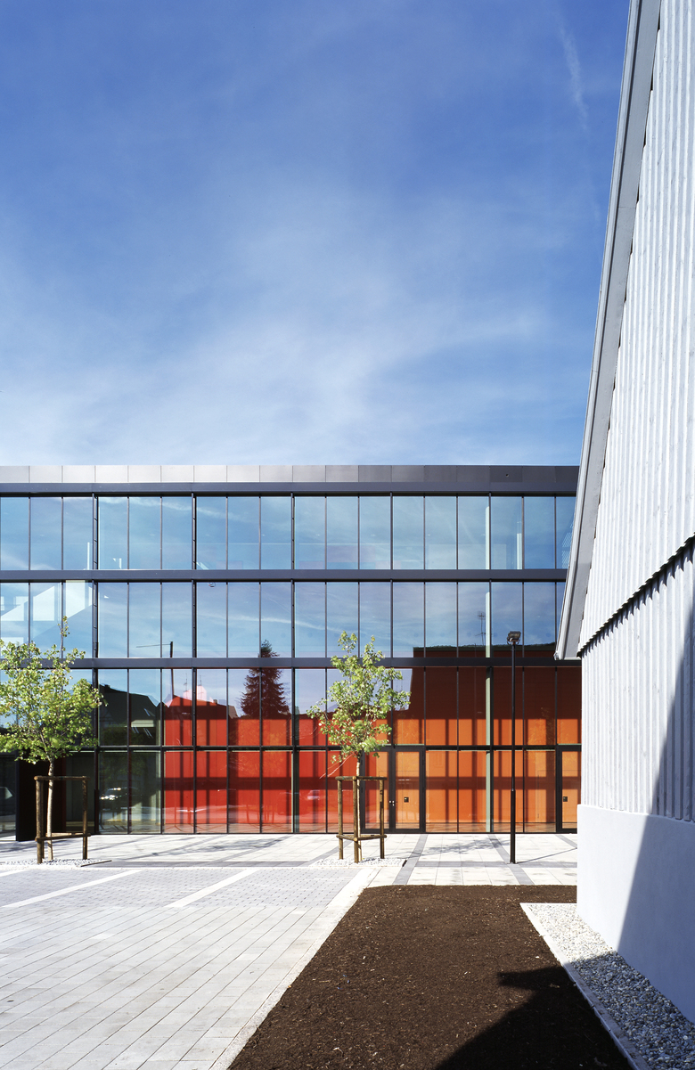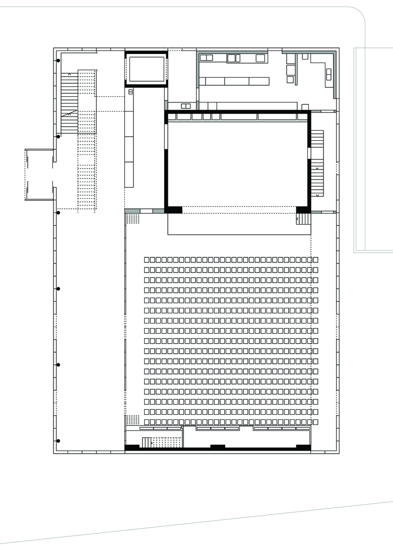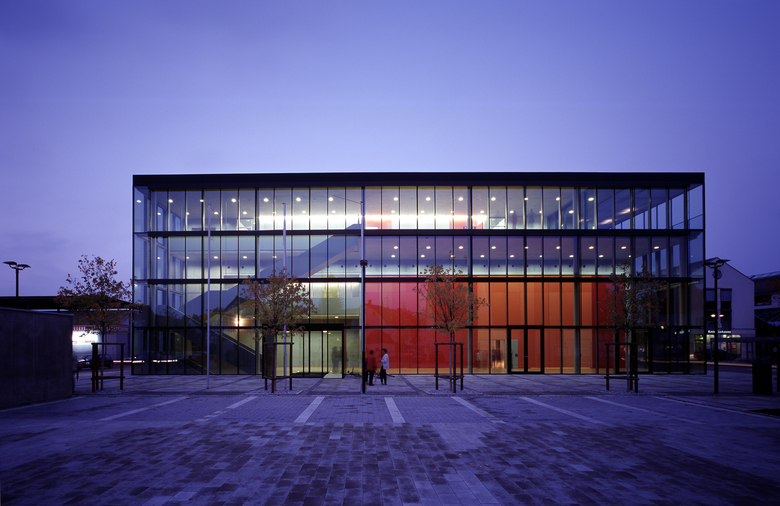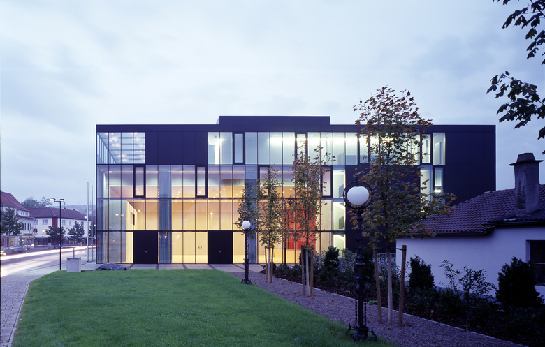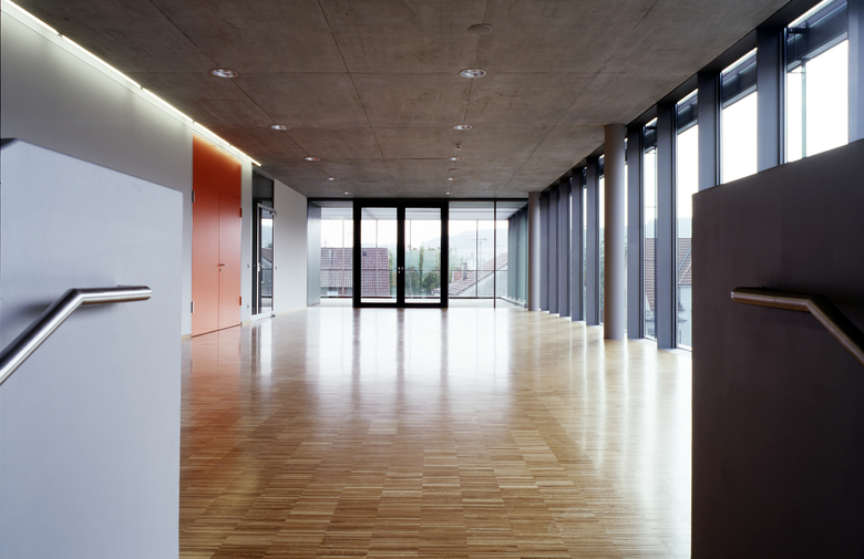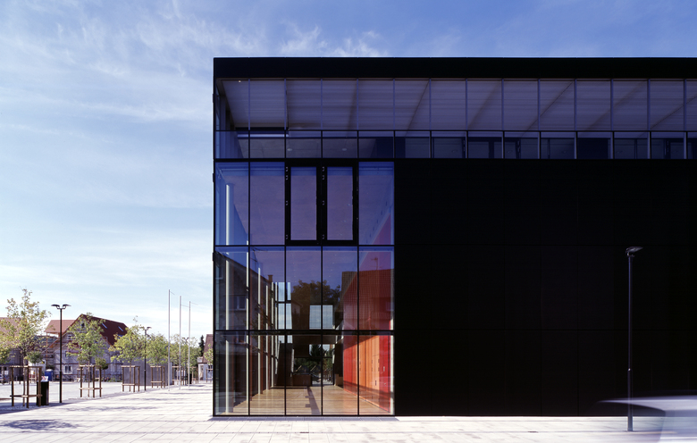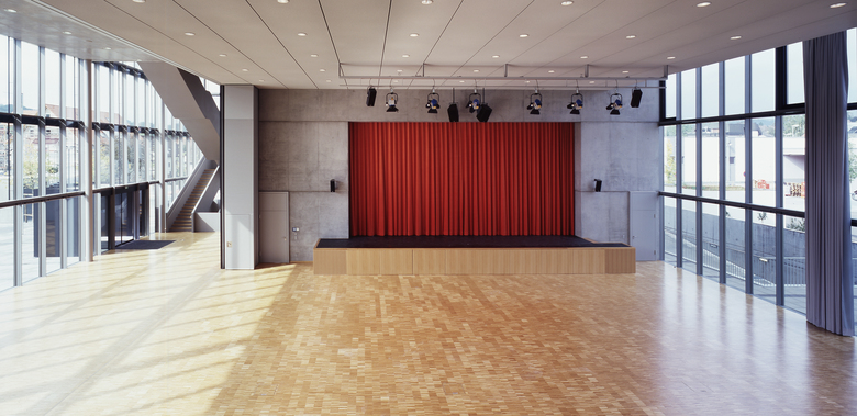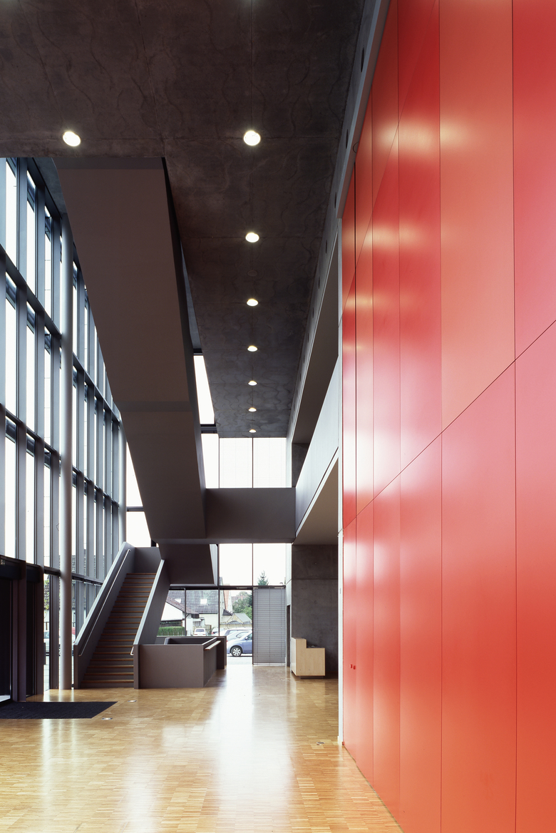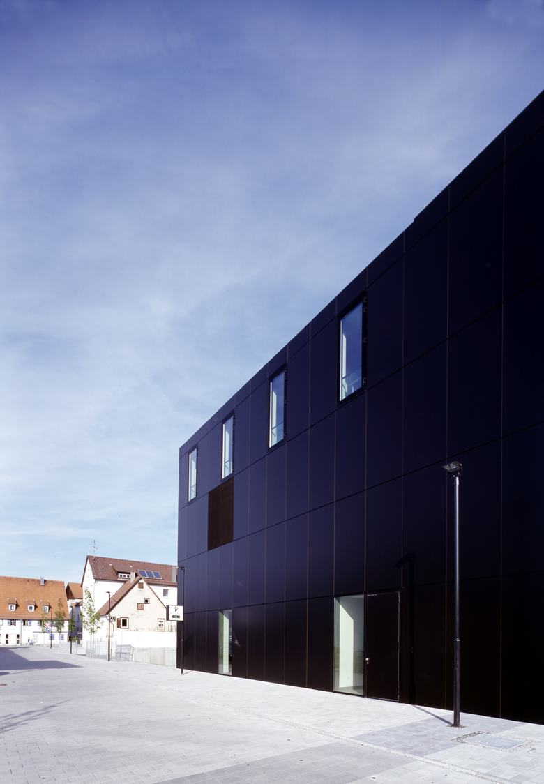 Die Planung des Gebäudes wurde maßgeblich durch die städtebauliche Idee ge­prägt ein Kulturzentrum - nicht wie üblich in der Fläche - sondern als Geschoßbau zu entwickeln. Dadurchverblieben im städtebaulichen Kontext der Stadtmitte von Uhingen wertvolle Flächen unbebaut die als Freibereiche genutzt, oder zu einem späteren Zeitpunkt überplant werden können. Die Umsetzung der Idee gestapelter Ver­samm­lungsräume die durch ein vertikales Foyer erschlossen werden, wirkte sich neben einer Nutzungsverteilung auf vier Ebenen zwangsläufig auch konstruktiv aus. So wurde der große Saal im Erdgeschoß durch eine weit gespannte Deckenkonstruktion mit drei Unterzü­gen überbrückt, auf deren Fläche weitere kleintei­li­ge­re Säle und Konferenzräume angeordnet sind. Das innenräumliche Konzept basiert auf der Interaktion zwischen eingestellten Volumen und äußerer Hüllfläche: Innerhalb eines durch die Gebäudefassade formulierten Raumes werden massive Bauteile und Kuben frei angeordnet, und teilweise vertikal gestapelt. Die verbleibenden Raumfolgen zwischen Fassade und den eingestellten Körpern dienen der Erschliessung und Kommunikation.