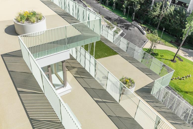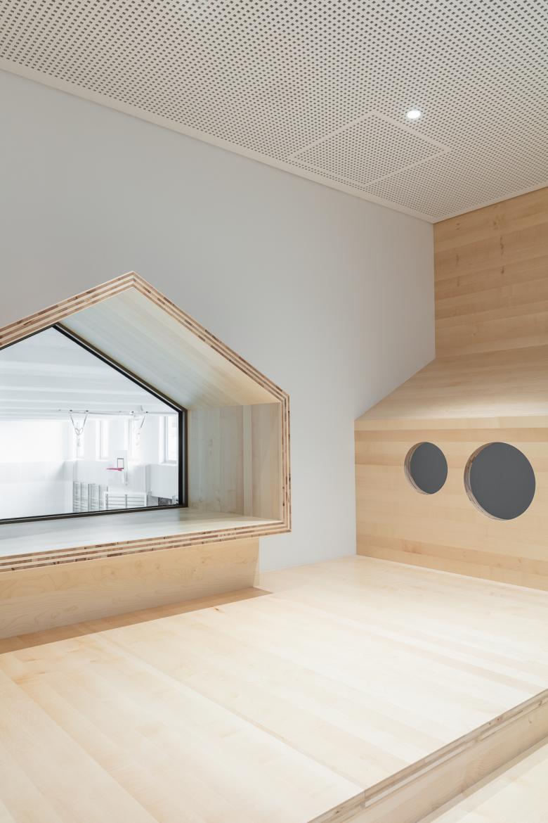 The school building is a simple, distinct, south-facing terraced structure that steps down two storeys. There are spacious terraces on every second floors. The northern façade has three-dimensional, meandering character.