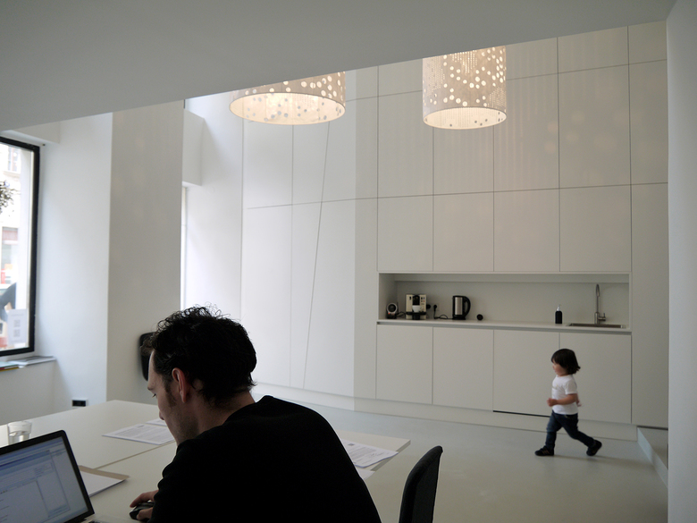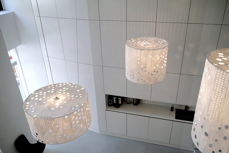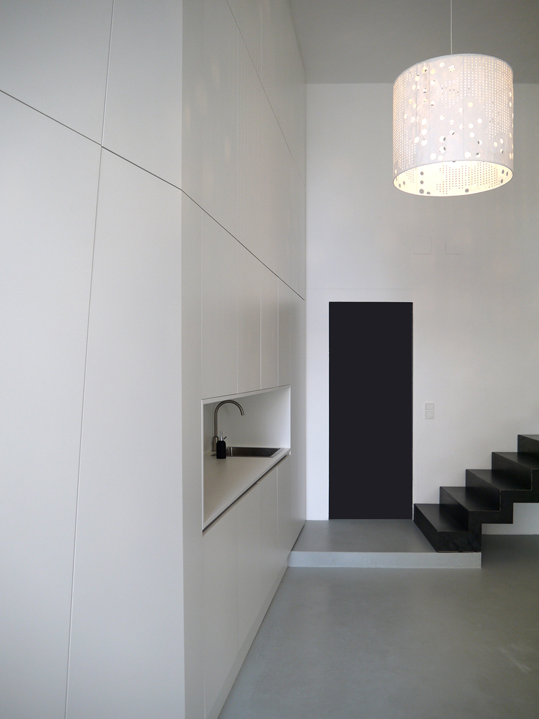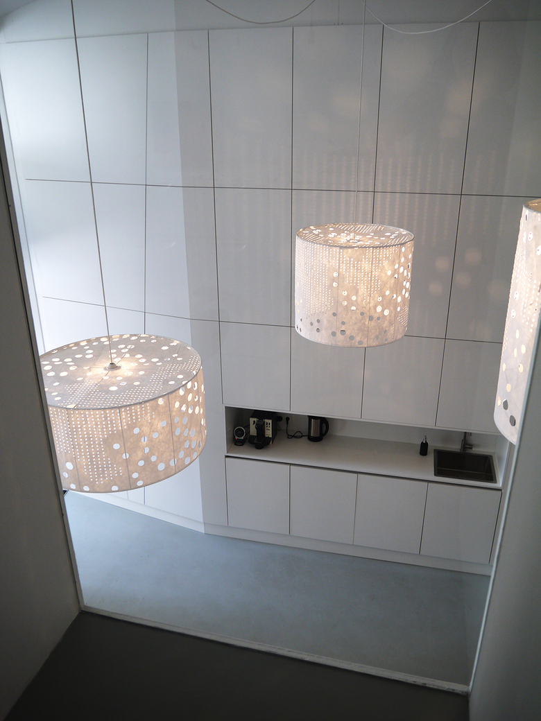 In einem bestehenden Geschäftslokal eines denkmalgeschützten Gebäudes in Wien wurden die Räume zusammengelegt und ein Galeriegeschoß eingezogen. Gestalterische Elemente sind ein raumhohes Möbel, eine Stahlstiege und eigens angefertigte Lampen. Die aufeinander abgestimmten Farben geben dem Raum einen monolithischen Charakter, der mit dem Schattenspiel der eigens gefertigten Lampenschirme die Raumkonfiguration betont.