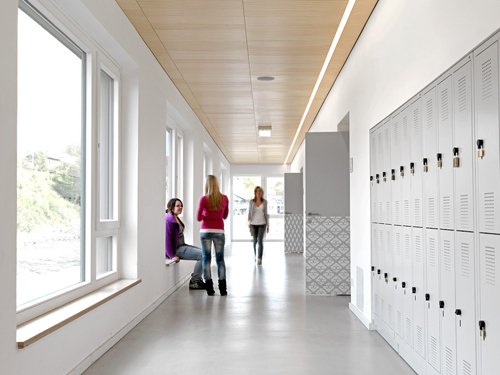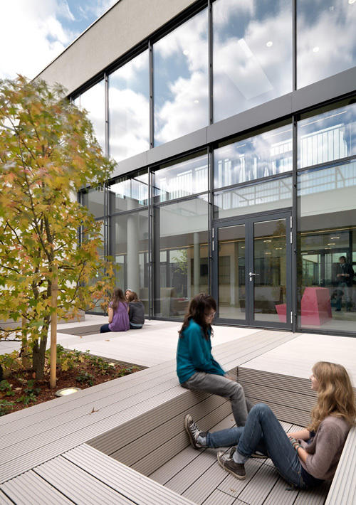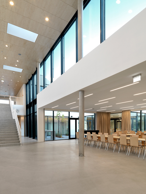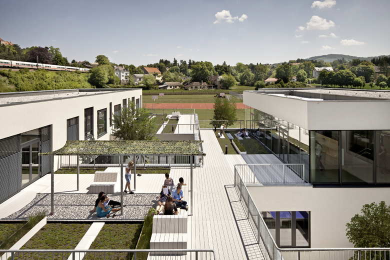 Ein zentrales Thema des Entwurfes der Schule ist das Verschmelzen von Innen- und Außenraum. Im Erdgeschoß bringen sechs kleine Innenhöfe Licht in die Sonderunterrichtsräume und Gänge. Im Obergeschoß gibt es zwei größere Innenhöfe, die von den Stammklassen umschlossen werden. Diese Höfe sind auf zwei Ebenen so miteinander verflochten, dass sie verschiedene Räume mit interessanten visuellen Verbindungen schaffen und zum Verweilen und Kommunizieren einladen. Jeder der Höfe ist mittels Pflanzen, Bodenmaterialien und Möbelierungen, je nach Funktion des angrenzenden Innenaums unterschiedlich gestaltet. So verfügt etwa der Hof neben dem Chemiesaal über einen Experimentiertisch für Versuche. Sämtliche Stammklassen sind nach Süden orientiert um eine optimale Belichtung zu erreichen. Diese Ausrichtung erweist sich zusätzlich als ideal, da der Lärm der Bahntrasse im Norden durch die interne Erschließung abgeschirmt wird. Die Form des Gebäudes, mit seiner flächigen Struktur leitet sich einerseits aus der grundsätzlichen Orientierung am Grundstück entsprechend dem städtebaulichen Konzept ab, das sich in Streifen parallel zum landschaftdominierenden Eisenbahn-Viadukt entwickelt und so einen direkten Bezug zum Umraum herstellt, andererseits aus der Idee ein möglichst energetisch kompaktes Volumen zu schaffen. Die Schüler gelangen bewusst von Süden kommend in die Schule um den gesamten Eingangsbereich zu einem öffentlichen Raum, eine sogenannte Esplanade, aufzuweiten. Dies geschieht mittels einer artifiziellen Landschaft aus Sitzmöglichkeiten, Bäumen und Bepflanzungen aller Art. Über diesen Vorplatz gelangen neben den Schülern auch externe Nutzer über einen separaten Eingang zum Turnsaal und Mehrzweckraum die flexibel mit dem Speisesaal und Foyer beliebig zusammen geschaltet werden können. Der Bau verfolgte von Anfang an ein ökologisches und nachhaltiges Grundkonzept. Eine kontrollierte Raumlüftung mit Wärmerückgewinnung sowie die Beheitzung mittels Erdwärme lässt die Schule in Kombination mit entsprechend dimensionierten Dämmstärken und aussenliegenden Sonnenschutz den Niedrigenergiestandard mit 13kW/Jahr m2 erreichen. Zusätlich wurde darauf geachtet nur ökologische Baustoffe zu verwenden. Somit geht die Schule nicht nur schonend mit den Ressourcen unserer Umwelt um, sondern hilft durch die hohe Energieeffizienz auch Betriebskosten sparen. Zusätzlich kann in der Schule durch das gewählte statische System eine flexiblere Adaptierung und Umnutzung für die Zukunft garantiert werden. Dies geschieht mittels zwölf Meter weit spannenden Betonfertigteilen, welche auf den aus Ortbeton hergestellten Außenwänden aufgelagert sind und somit die Verwendung von Trennwänden in Leichtbauweise anstatt gemauerter oder betonierter Wandscheiben erlauben.