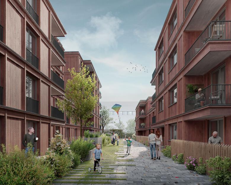 Das Konzept basiert auf dem städtebaulichen Grundgedanken, die vorhandene Zeilenstruktur durch die Setzung von vier riegelförmigen Volumen weiterzuführen. Diese ergänzen die Quartierstruktur im vorhandenen Kontext und gewährleisten eine strukturelle Differenzierung zwischen gefördertem Wohnraum und Eigentum.