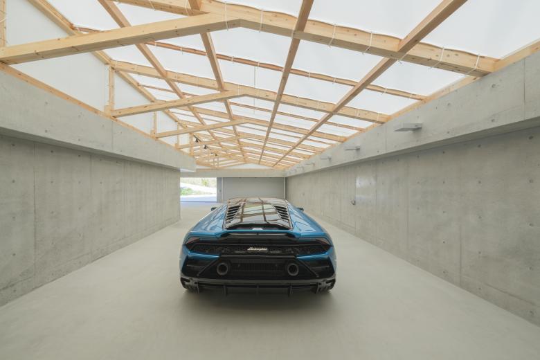 塀と一体化した強固なコンクリート壁で守られたガレージ棟は、ショールームをイメージしてデザインされ、昼間はテント屋根から全面的に自然光が降り注ぎ、夜はランタンのようにほのかに光る。