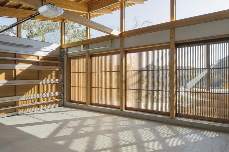 パーキング棟とメイン棟には木製の縦格子シャッターが設置され、風通しと採光を確保することで、閉め切っていても室内が暗くならず、風通しの良い快適な室内環境を作り出している。