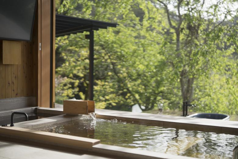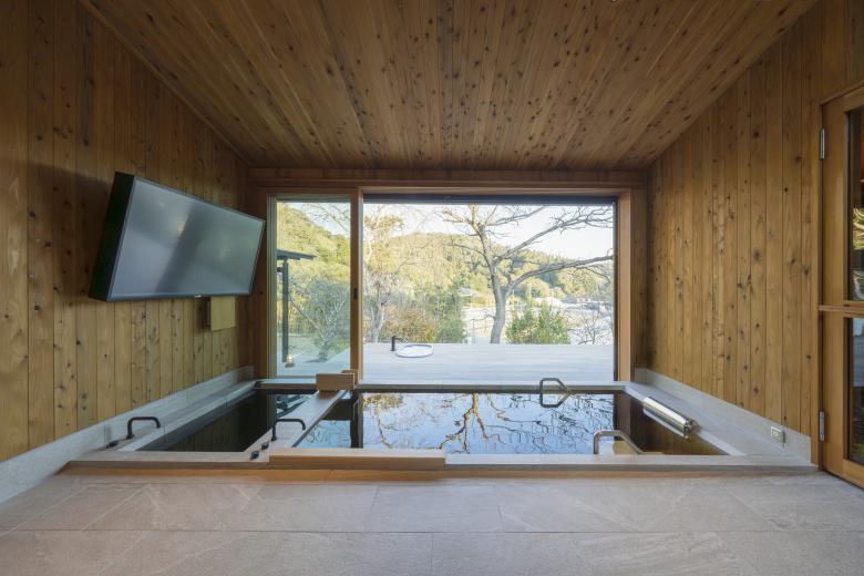 隣接するスパ棟では、ジャグジーや打たせ湯をはじめあらゆるタイプのお風呂を源泉掛け流しで楽しむことができる。さらに、サウナもドライ、ミスト、岩盤浴と充実している。