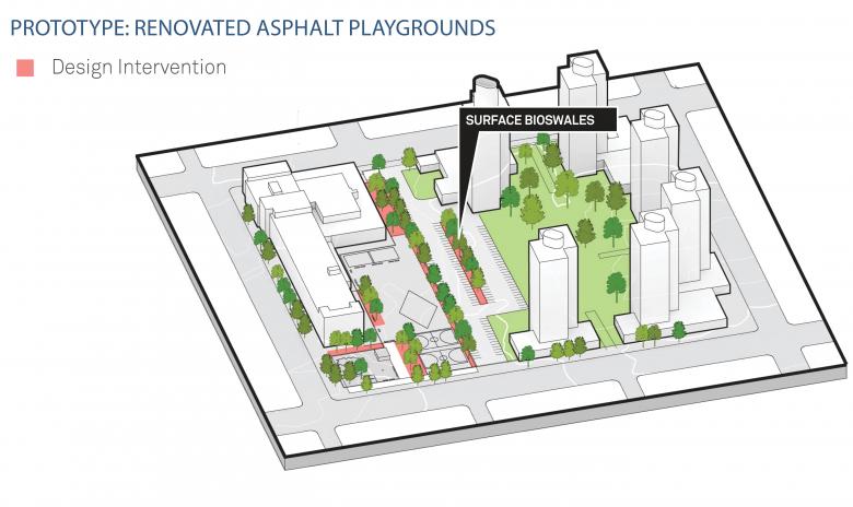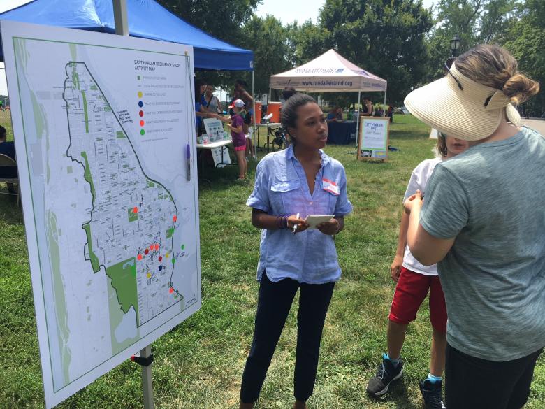Through an innovative stakeholder outreach strategy, the team partnered with DREAM in order to closely collaborate with community institutions and residents and to offer a curriculum in resiliency planning to DREAM high school students. The resiliency planning curriculum at DREAM exposes students to principles and professional methodologies related to neighborhood mapping, analyzing social vulnerability, and designing green infrastructure. The team’s overall goal with this program was to build a culture of resilience in East Harlem by empowering young scholars at DREAM to be leaders on climate in their communities. At the end of the course’s first year, for example, students worked with Washington Houses to help install a new rain garden on the campus and survey residents about their emergency preparedness needs—resulting in publication of a 30-page, site-specific pocket guide called Washington Houses Ready.