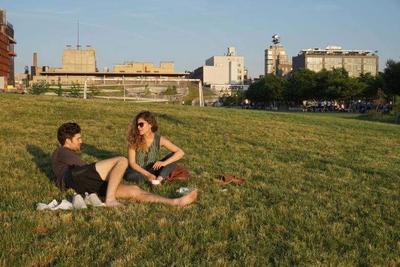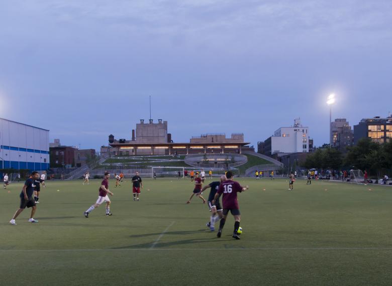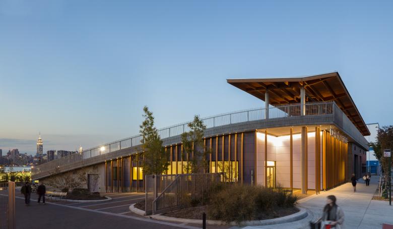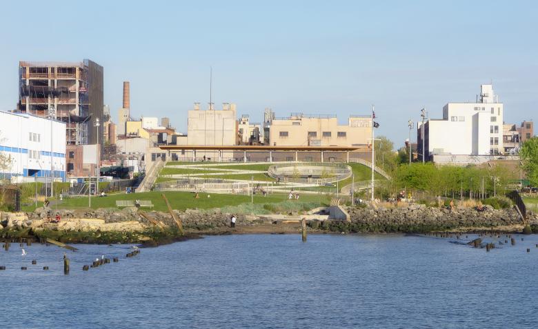Bushwick Inlet Park reclaims the abandoned East River shore of Brooklyn for recreation and nature. The first phase of the park, designed by Starr Whitehouse and Kiss + Cathcart Architects, creates a sequence of places arrayed along a generous park promenade to the water. A new field house on Kent Avenue combines park maintenance functions and separate community spaces, while maximizing the public use of the park land: the fully-accessible green roof slopes dramatically to the ground in the west, providing a playground, terraced lawns, and commanding views over the park towards the river and Manhattan. Sustainable systems include in-ground heating loops, photovoltaic electricity, and irrigation with collected site water. A multi-purpose sports field supports year-round community recreation and provides below-ground stormwater storage. At the waterfront a grass knoll echoes the slope of the field house and a terrace of permeable pavement gives a tree-shaded overlook on the shore. The waterfront supports marine and avian life, with an off-shore island, a varied rocky edge, and marsh plantings. A freshwater pool of filtered site storm water and native upland plantings provide shelter, food and drink to migrating birds.