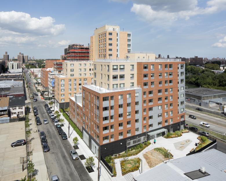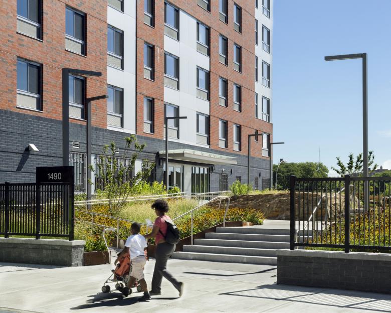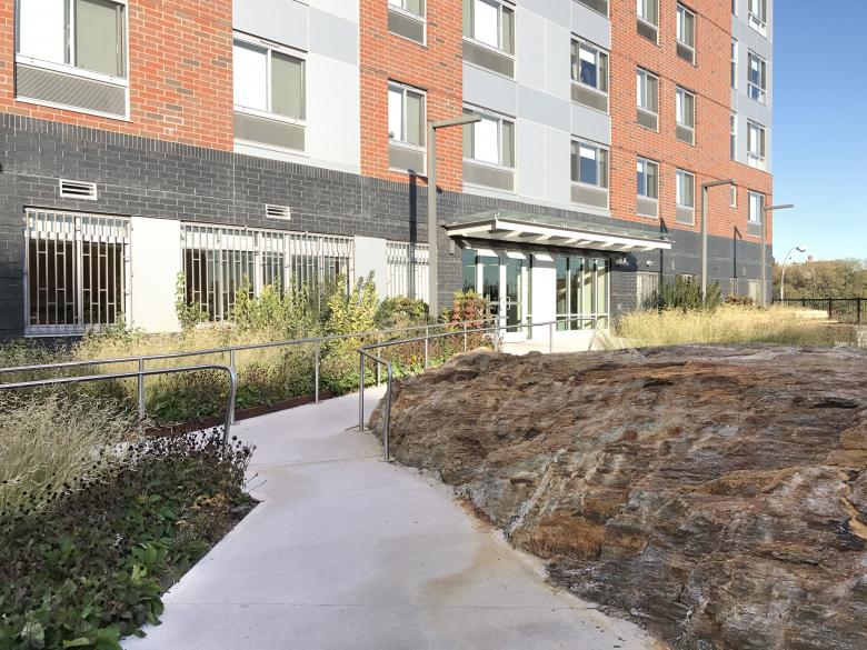 With 41,000 SF of outdoor space, the initial phase of the Compass Residences presents a unique opportunity to create a journey through local Bronx ecologies. Taking up this challenge, Starr Whitehouse designers created two courtyards for the site, both split between at-grade and over-structure conditions. Sloping up from the street, the courtyards preserve and re-integrate the large, natural boulders that were excavated at the site, tracing a network of angular paths that echo the area’s rocky topography. Shade-loving woodland plantings in the inner courtyard and a more open, upland clearing at the through-block terrace add to the sense of journey, evoking the high meadows and deep glens that once surrounded these outcroppings and integrating the new urban neighborhood with its natural history.