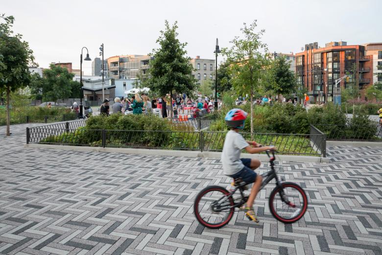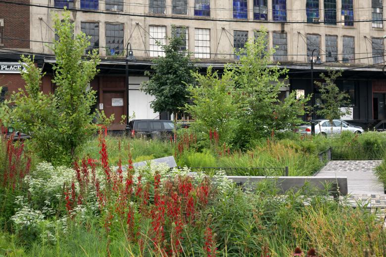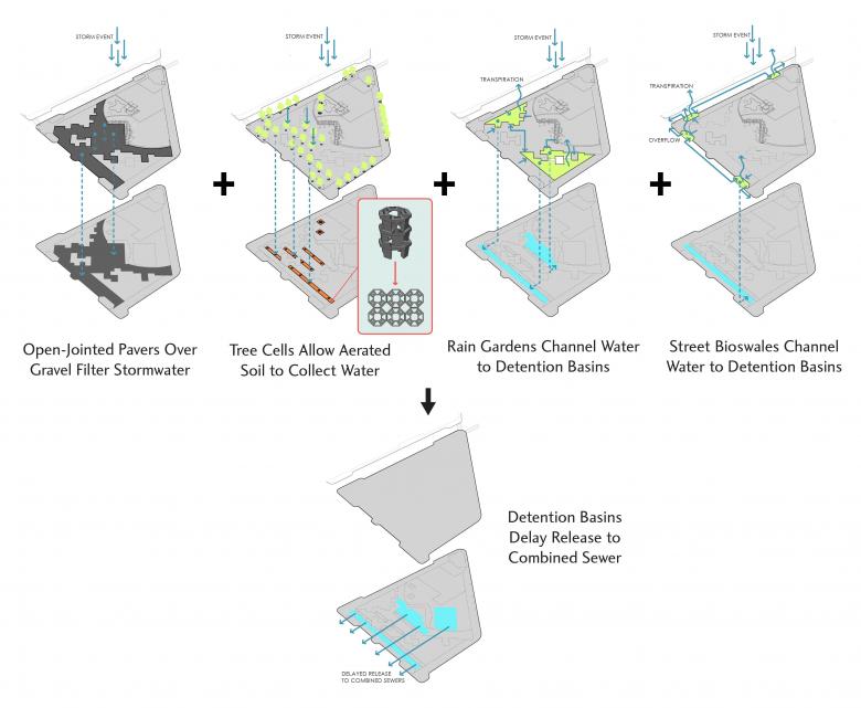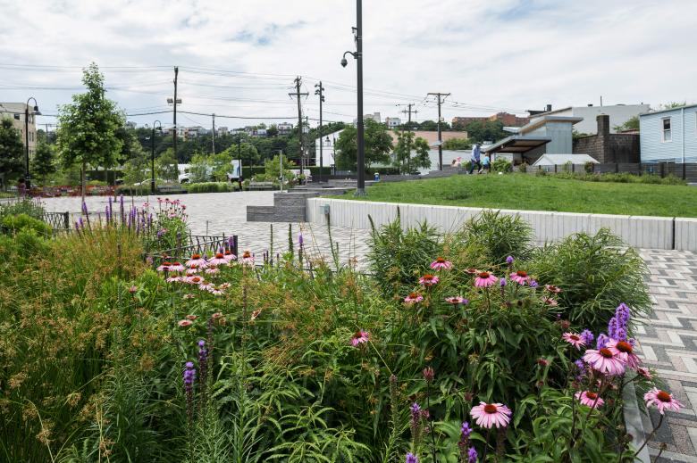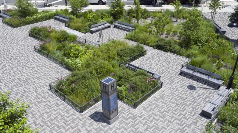 In a flood-prone corner of Hoboken, Starr Whitehouse led an interdisciplinary team of engineers, designers, and cost estimators to craft a resilient core of stormwater detention systems tucked into a community-designed urban park. Developed with residents in an intensive series of design workshops, the park’s interlocking social spaces enliven this former industrial neighborhood, enhancing the community that it defends. Densely planted rain gardens crossed by wood deck paths frame the park’s interior. A granite amphitheater accommodates scheduled and impromptu gatherings, stepping up to a grassy knoll ideal for soaking up the sun. A sculpted dog run creates a social node, while a perimeter pedestrian mall supports outdoor markets and food trucks. To capture stormwater, Southwest Park employs three coordinated systems: open-jointed pavers supported by tough, hollow tree cells infiltrate rainwater in paved areas of the park interior, filtering it through a gravel bed before it percolates into the soil; in unpaved areas of the park, water is soaked up by the grassy lawn or one of two large rain gardens, passing through sandy soils and native plants to filter out pollutants; finally, water from adjacent streets and sidewalks is channeled through vegetated bioswales in the public right of way, filtering through hardy plants and sandy soil that can withstand tough urban conditions. During heavy storms, excess runoff is directed to three below ground detention basins. From here, an automated sensor allows controlled outflow into the combined sewer. All together, the park is capable of detaining up to 190,000 gallons, a volume far beyond the ten-year storm it was designed for.