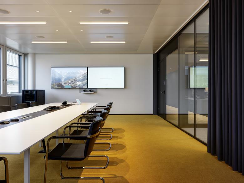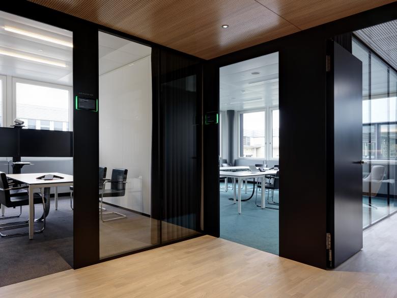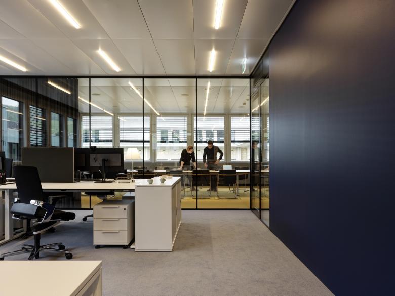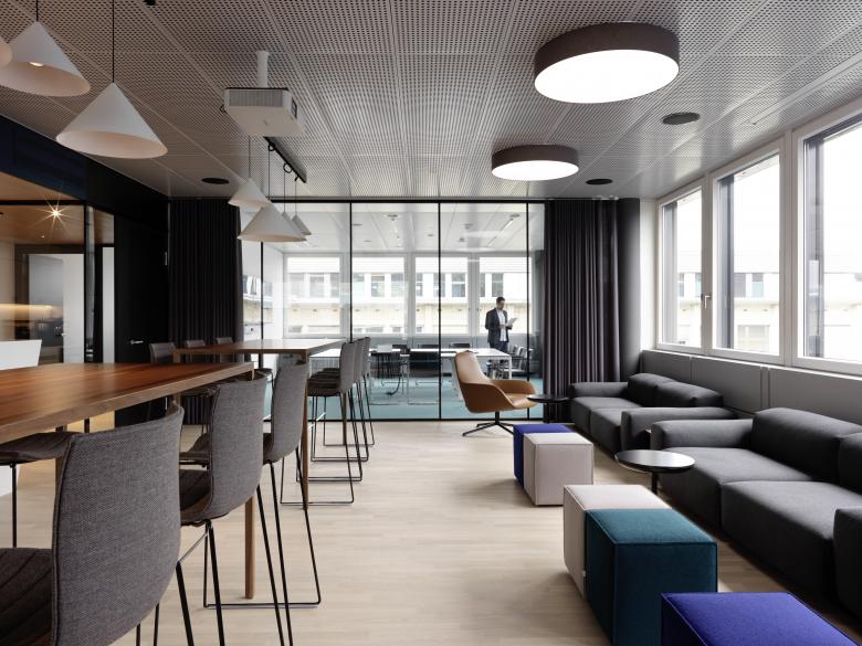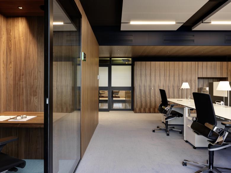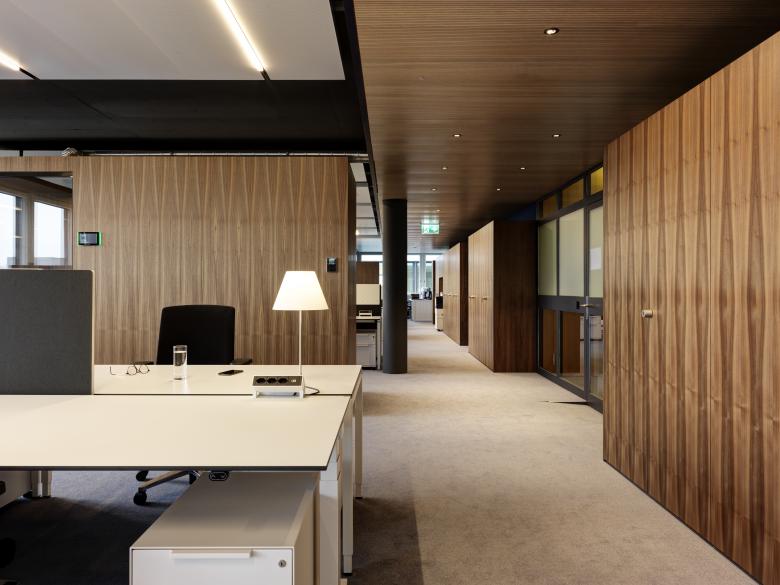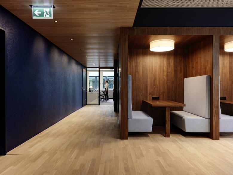 Ein Glück, vom Auftraggeber freie Hand zu erhalten und das neue Headquarter von Grund auf neu gestalten zu dürfen. Die Architektur des Büroausbaus richtet sich nach den Farbtönen der Corporate Identity der Firma. Gleichzeitig wird durch den Einsatz von warmen Holzmaterialien und Textilien ein angenehmes Arbeitsklima für ca 40 Mitarbeiter geschaffen.
