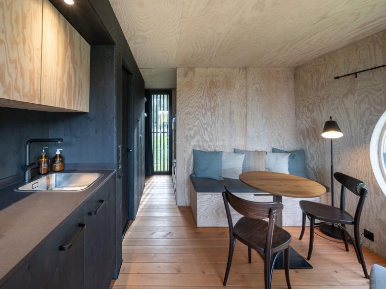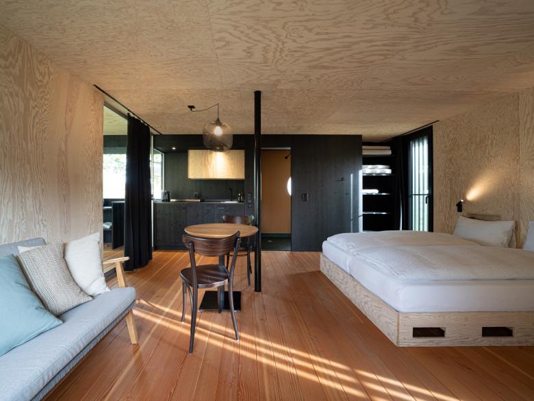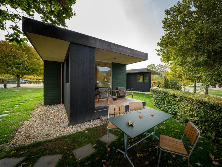 Neukonzeption von Mietobjekten auf einem bestehenden Campingplatz am Bielersee. Die verschieden grossen Cabins sind in einer losen Anordnung gestreut. Die Architektur nimmt Elemente der Hauptgebäude auf und wird spielerisch mit Elementen aus dem Schiffsbau ergänzt. Die Cabanons wirken modern und hochwertig. Jedes Haus ist mit einer Nasszelle, Küchenzeile, sowie einer gedeckte Veranda ausgestattet. Die Freiraumgestaltung sieht ein Wegenetz mit schattenspendenden Bäumen, sowie niedrigen Buschhecken vor. Die Materialwahl ist zurückhaltend mit grün oder schwarz behandelter Holzschalung aussen, innen ist der Raum mit Seekieferplatten eingekleidet.