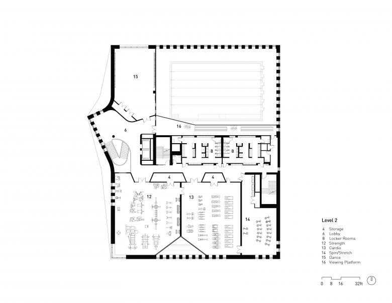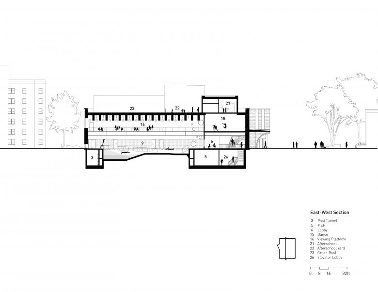 The Center’s three lower levels are dedicated to recreation and exercise. They house a gymnasium, walking track, and double-height competition-grade swimming pool—all of which are visible from the lobby—as well as dance and fitness rooms. Openings between floors maximize visual and physical connections between programs and establish a vibrant and airy atmosphere. The Center’s upper level is designed to host a range of community amenities from afterschool programs to a media lab, named for East Flatbush business leader Dr. Roy A. Hastick, Sr. Daylit learning spaces for kids, teens, and adults lead outdoors onto a wrap-around rooftop terrace and gardens where people can connect with nature in a peaceful environment that nurtures their physical and mental health.