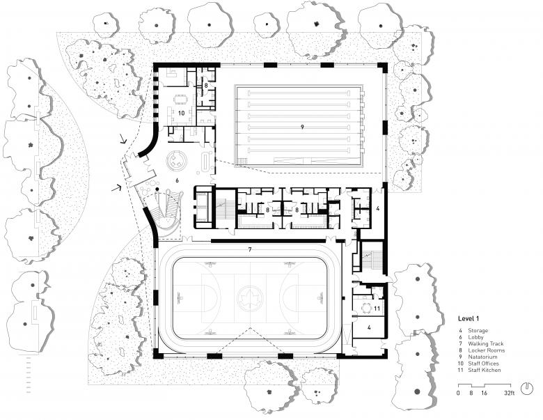 To achieve a low carbon footprint, the team carefully modeled and optimized the Center’s energy use. The design includes a high-performance building envelope, an energy recovery system, and all-electric heating and cooling. A whole-building life-cycle assessment guided material choices, helping to reduce the environmental impacts of extraction, manufacturing, and transport. The design also prioritizes healthy and durable materials, such as mass timber which performs well in humid pool areas. These efforts are complemented by expanded tree cover, green roofs, water use reduction strategies, and a responsible stormwater system, contributing to a healthier, more connected community and environment.