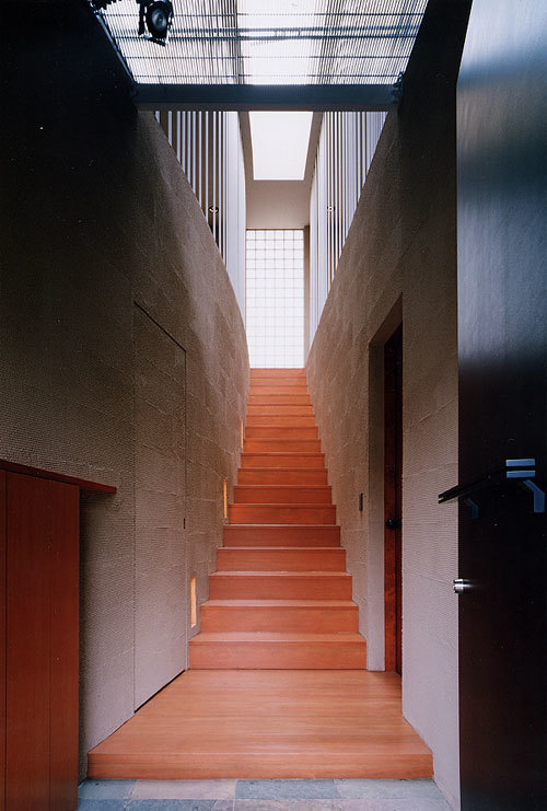 A skylight in the upper portion of the staircase brings in the outside.