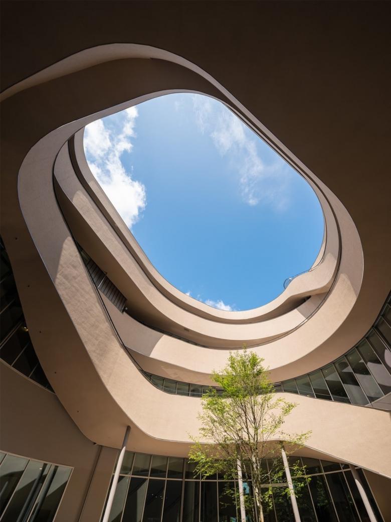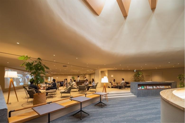 自然光が入る360度開かれた500人収容の「太陽のホール」、食を通して語らう場である「風のパティオ」、創業者精神を学び、自分自身と向き合う場「水のサロン」、その三つのエリアがメビウスの輪のように絡みあう動線でつながることで、有機的に連続し、人間の活動を制限しない空間をイメージした。