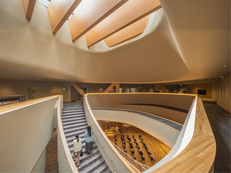 3・4階は宿泊ゾーンであり、研修後の熱気もそのままに集える「マスターリビング」を太陽のホール上層に設け、吹き抜けで繋いでいる。