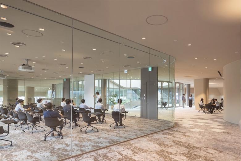 研修エリアの1・2階は、スロープによって連続したフロア構成となっている。「Studio」と呼ばれる研修スペースを中心に、あらゆる場所がオープンで連続的に使うことができる。