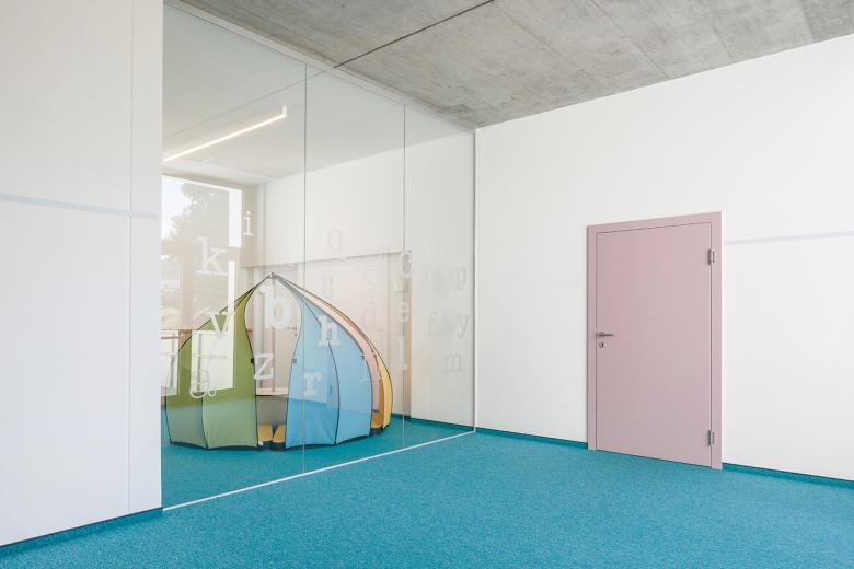 Die bestehende Schule lebt von ihre Materialqualität, denn das Spiel zwischen Holz, Glas, Beton und Teppichböden ist harmonisch inszeniert.