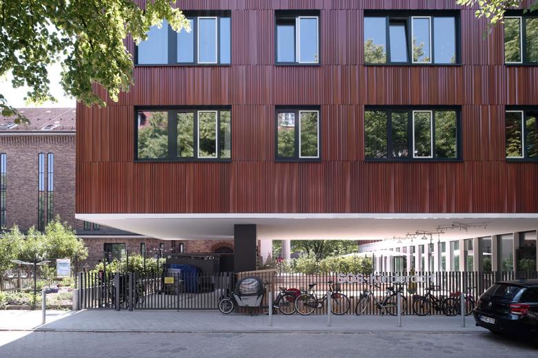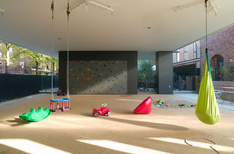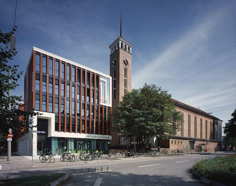 In dem innerstädtischen Neubau werden verschiedene Nutzungen zusammengefasst: ein innerstädtisches SOS-Kinderdorf, in dem in Wohngruppen Pflegekinder mit betreuenden Pflegeeltern als Familie zusammenleben und ein Familienzentrum als Ort der Begegnung für Familien, Bildung und Unterstützung von Familien, mit Café, Kleiderkammer sowie Bewegungsräumen. Räumlich sind die Bereiche des introvertierten SOS-Kinderdorfes von dem öffentlichen Familienzentrum getrennt angeordnet. Ein gemeinsamer Erdgeschossbereich sowie der Kellerkasten vereinen die zwei Baukörper und deren Nutzungsbereiche.