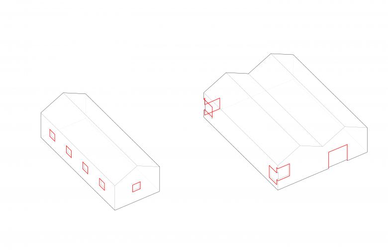The current windows on the walls are small and evenly distributed due to the limitations of the mechanical properties of rammed earth. Thus, it is difficult to construct larger window openings. Additionally, the original mushroom breeding houses had a sensitive requirement for light. As a result, the overall facade appears relatively closed-off. However, with increasing demands for comfort, these smaller windows are no longer able to meet the requirements for lighting and ventilation.