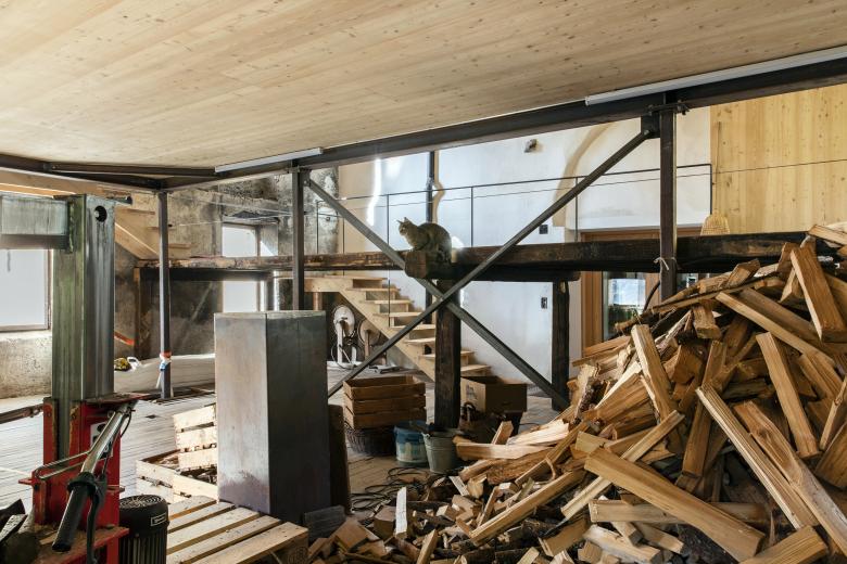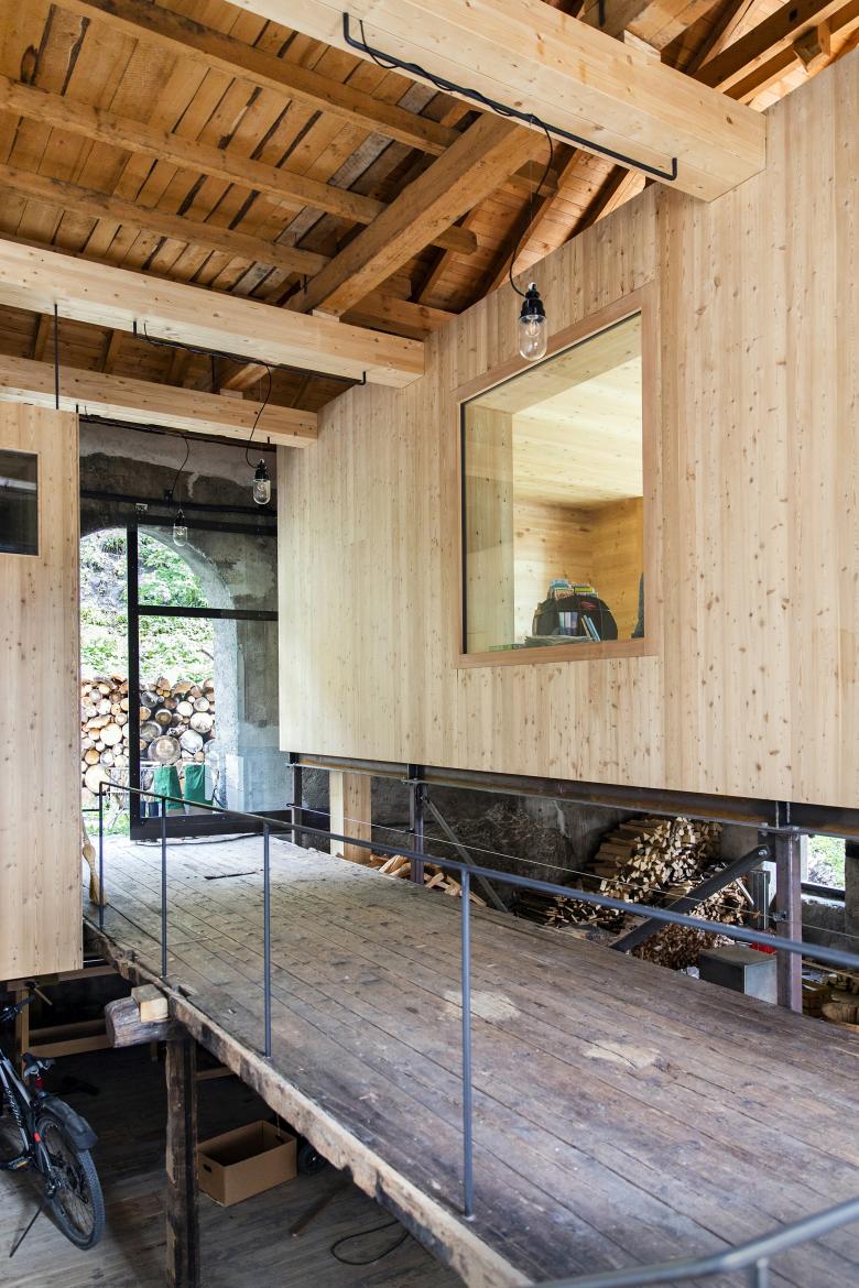 In einem für die Landwirtschaft nicht mehr benutzten Heustall steht auf dünnen Stahlstützen ein neuer, heller und beheizbarer Raum aus Fichten- und Lärchenholz.