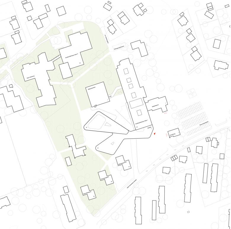 Der weich geschwungene, kompakte Baukörper ermöglicht einen möglichst geringen Fußabdruck des Gebäudes mit relativ großen, parkähnlichen Freianlagen in Hanglage. Die geometrische Ausrichtung ergibt sich aus der Idee, einen großen