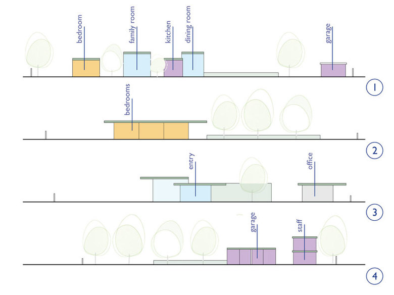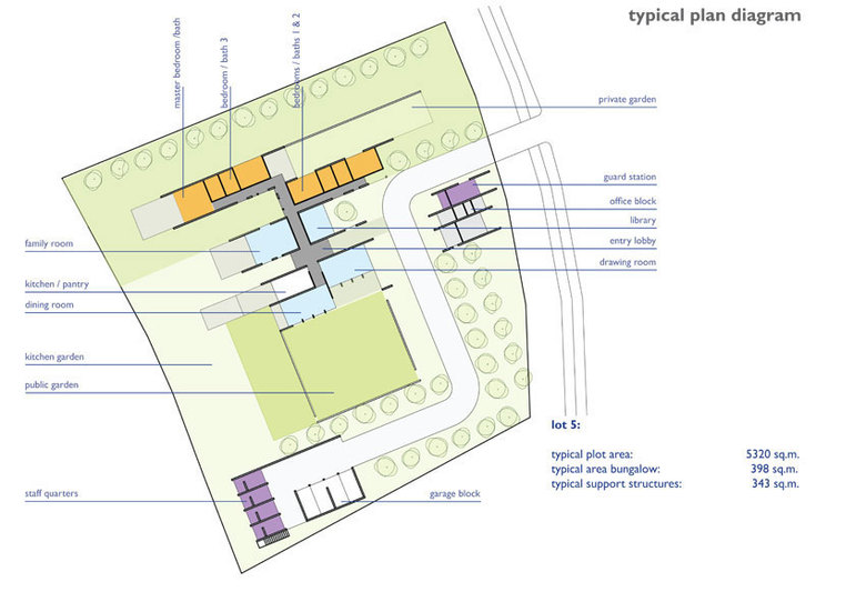 The identity and character of the residence was critical - both the significant urban location and symbolic function as accommodation for senior members of the Indian government must be embodied in the design. These residences were to serve as exemplary models of contemporary building technology and environmental engineering. The existing bungalows express an architecture that has proven completely unviable given the local climate; moreover they are cast in the image of a dated colonial architecture. The new residences should reflect an evolution in terms of architectural iconography while fulfilling the mandate of a stately residence. The integration of landscape and architecture - innovative sectional relationships between the earth, the building, the garden, and the sky – may offer a thesis for the design. The scale of the existing bungalows conforms to an approximate datum of 6 meters in elevation. However, this datum reflects a constant relationship with the ground plane. By creating a series of terraced gardens, the massing of the residence may be excavated into the earth, creating a thermal buffer for natural insulation.