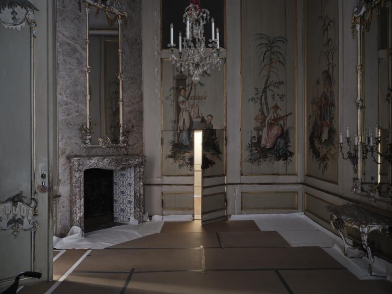 Der respektvolle Umgang mit all diesen Überlagerungen und Zeitschichten spielt eine große Rolle in der aktuellen Projektbearbeitung. Der Neue Besucherempfang wird in den sehr hochwertig ausgestatteten Räumen der Unteren Roten Kammern angeordnet. Die neuen Einbauten für diese Funktionen werden freistehend und reversibel in der Mitte der Räume mit großzügigem Abstand zu den Wänden und mit Bezug auf die Raumachsen angeordnet. Zum Schutz der hochwertigen Wandoberflächen sind hier bauliche Absperrungen vorgesehen, die gestalterisch dezent in die Räume integriert werden.