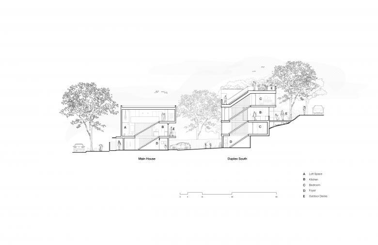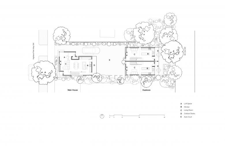 The main house sits along the busy arterial of Highland Park Way, while the duplex is nestled into the hillside and wooded greenbelt along 8th Ave. Both buildings are well connected to place - strategically placed windows focus views in between adjacent buildings and towards trees and nature. The main house is entered through a front porch off the sidewalk on Highland Park Way and the duplex has entries from both the auto court and from a porch the pedestrian access off 8th Ave. This connects the entire site, using the steep slope as connecting device between the two streets. The site plan was composed by careful arrangement of outdoor living spaces, green roofs, and large south facing windows. Green roofs, terraces, and porches create ‘buffer zones’ that filter between privacy and openness. Landscape is used as mediator to allows for subtle gradations of public and private, allowing the residents to choose when to be seen and when to be private.