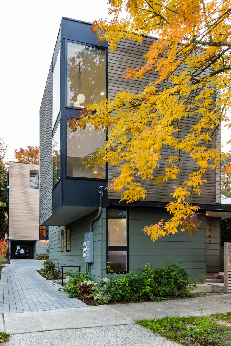 Rapidly escalating construction costs in Seattle have resulted in high volume, low quality market rate housing. 2019 construction costs in Seattle were the sixth highest in the world, averaging $338/SF, and the high cost of construction has led to a proliferation of generic production housing, transforming Seattle into neighborhoods of hermetically sealed hardie-panel faux modern boxes, built of low-cost materials and disconnected from the outdoors. Tsuga Townhomes set out to resolve this paradox of low cost and high quality, working to achieve excellent sustainable design while balancing the construction cost proforma. The 3-unit urban infill project was completed at a cost of $185 per square foot — a 54% reduction in cost from the Seattle average while raising the bar for design and sustainability. Using design to maneuver complicated development restrictions, the project fit three dwellings on a 5,040 square foot site that was designated an environmentally critical area steep slope.