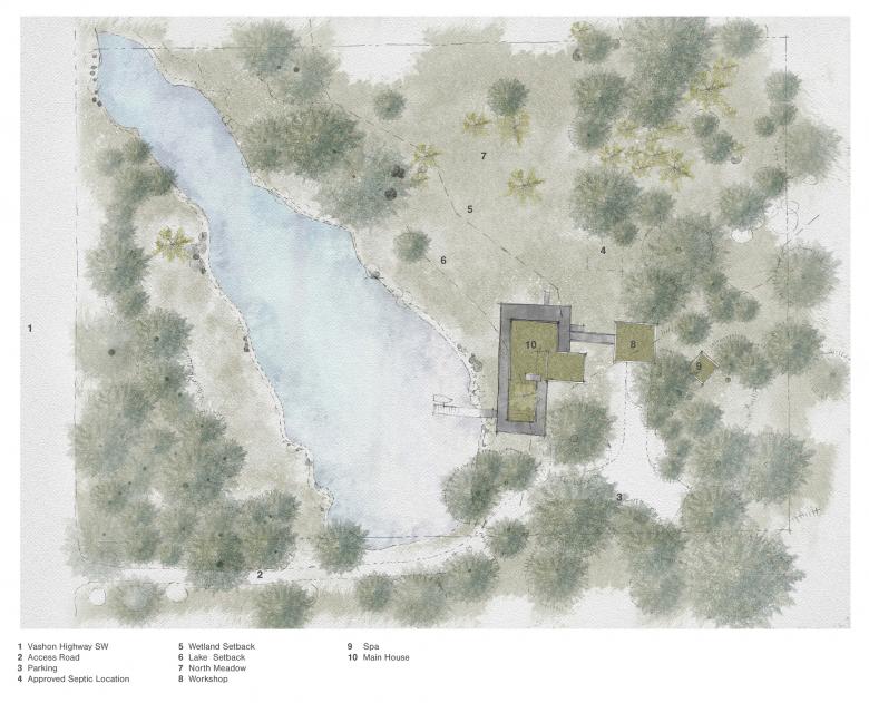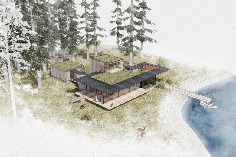 Currently under construction, Whispering Firs is a new residence carefully placed within a mature fir tree grove and between several wetland boundaries. Working with the Vashon Land Trust, the small footprint seeks to protect the land and protect natural ecosystems. Designed by Wittman Estes.